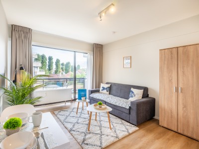 De studio is rustig gelegen op de eerste verdieping en bestaat uit een inkom, badkamer met douche en toilet, woonruimte met open ingerichte keuken, sofa / divanbed voor 2 personen. Balkon met tafel en 2 stoelen voor een gezellig ontbijt of apérootje buiten met zicht op de achtertuin. Er is ook een fietsbergplaats op het gelijkvloers.