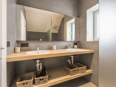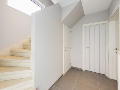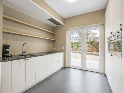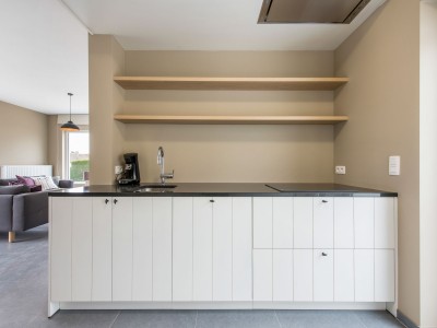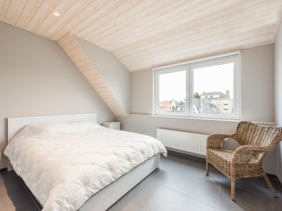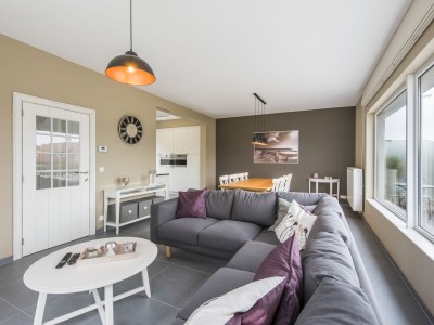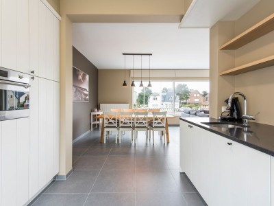 Hall, woonkamer/eetkamer, open volledig ingerichte keuken, toegang tot het zonnige terras, 3 slaapkamers, badkamer met inloopdouche en toilet. Er is ook een toilet op het gelijkvloers. Grote garage, grote berging en parkeerplaats voor het huis.