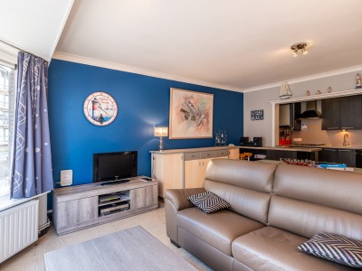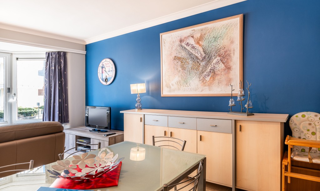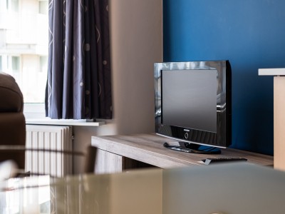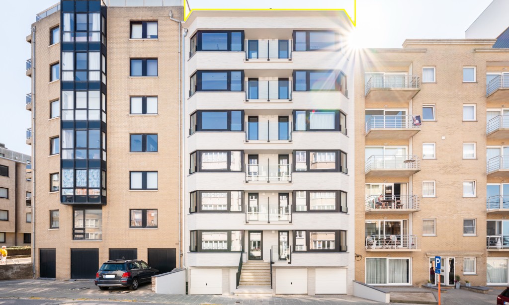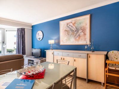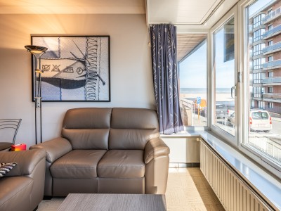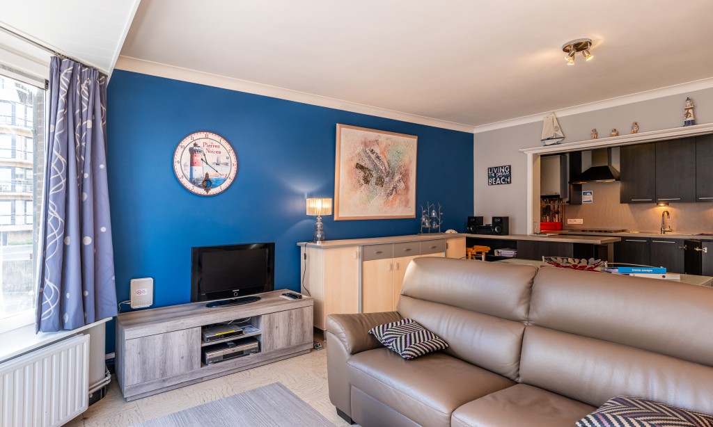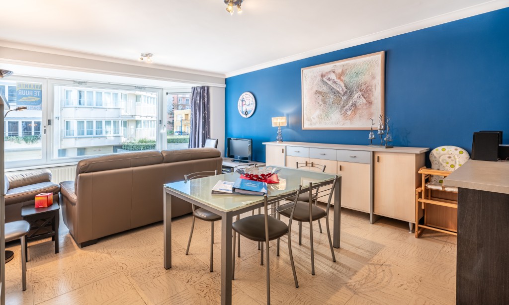2-slaapkamer appartement op het verhoogd gelijkvloers. Het appartement is gelegen op een paar passen van de zee en dicht bij de winkels en restaurants. Modern ingericht, voorzien van alle comfort. Er zijn een 10-tal treden voordat men de ingang van het gebouw bereikt. Zijdelings zeezicht vanuit de woonkamer. Wifi en digitale Tv. Huisdieren verboden.