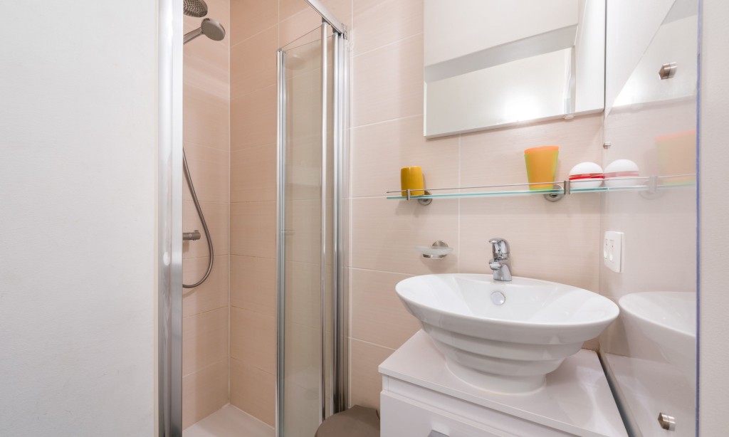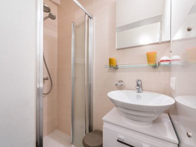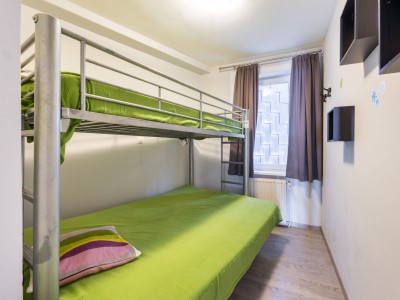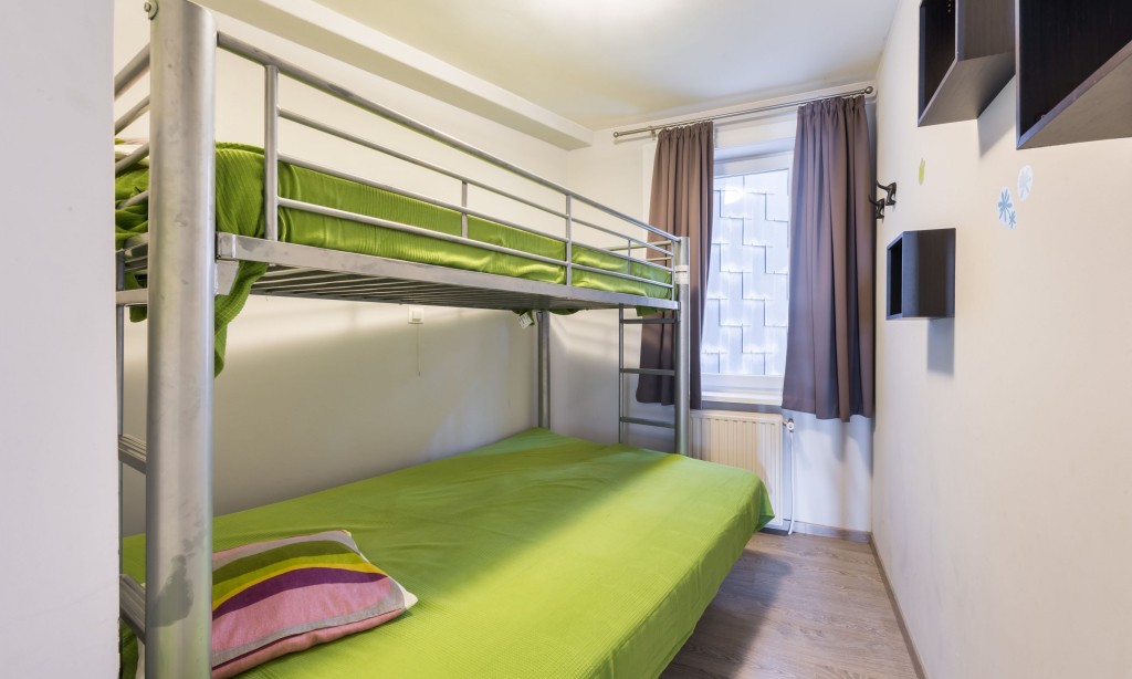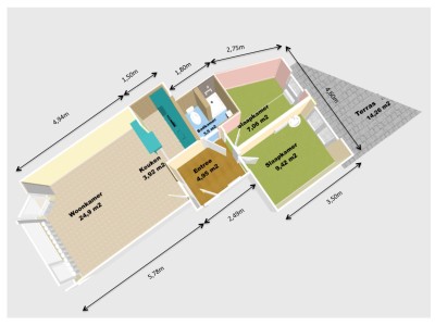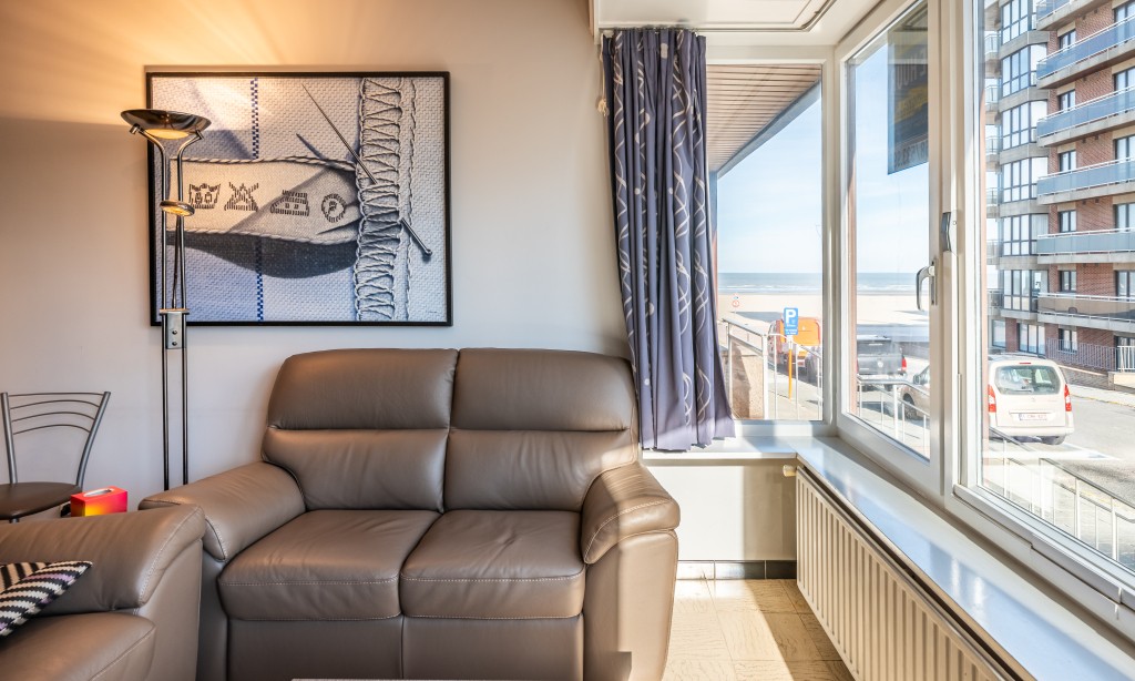 Hall, woonkamer met zeezicht, open ingerichte keuken, badkamer met douche en toilet, slaapkamer met dubbelbed, slaapkamer met stapelbed voor 3 personen. Ingesloten terras achteraan. Garagebox op 250m inclusief.