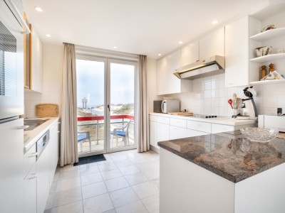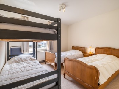 Het appartement bestaat uit een hal, toilet, berging, badkamer met bad en douche, slaapkamer met dubbel bed en slaapkamer met stapelbed en 2 éénpersoons bedden, zonnige living met volledig ingerichte en open keuken.