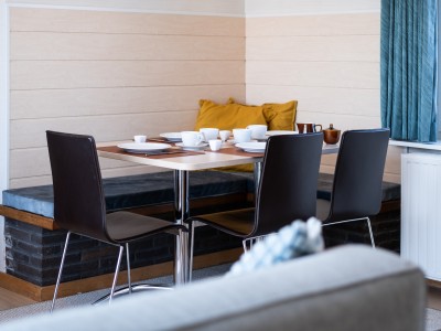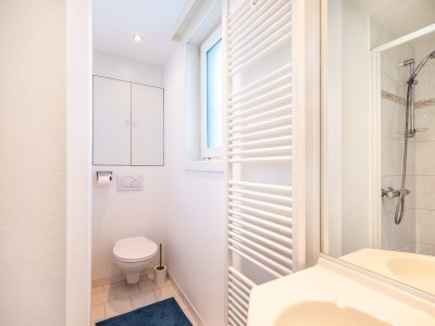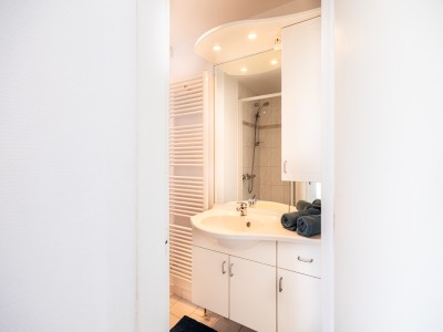 Hall, woonkamer met divanbed voor 2 personen, aparte keuken, badkamer met douche en toilet, slaapkamer met dubbelbed. Terras aan de kant van de woonkamer .