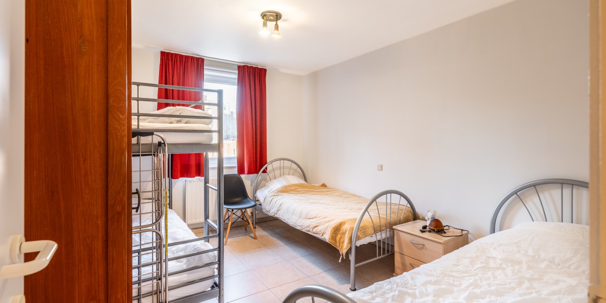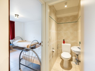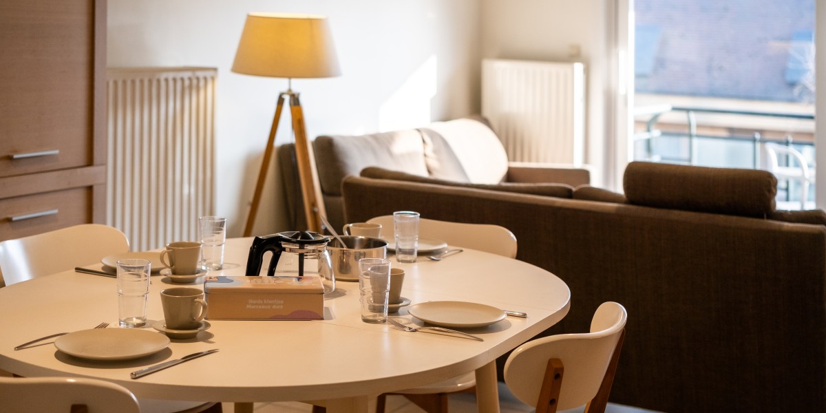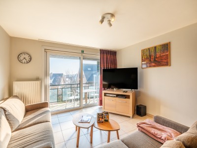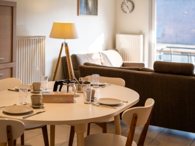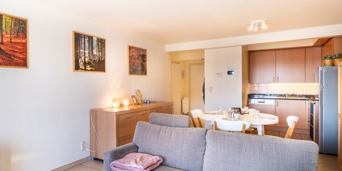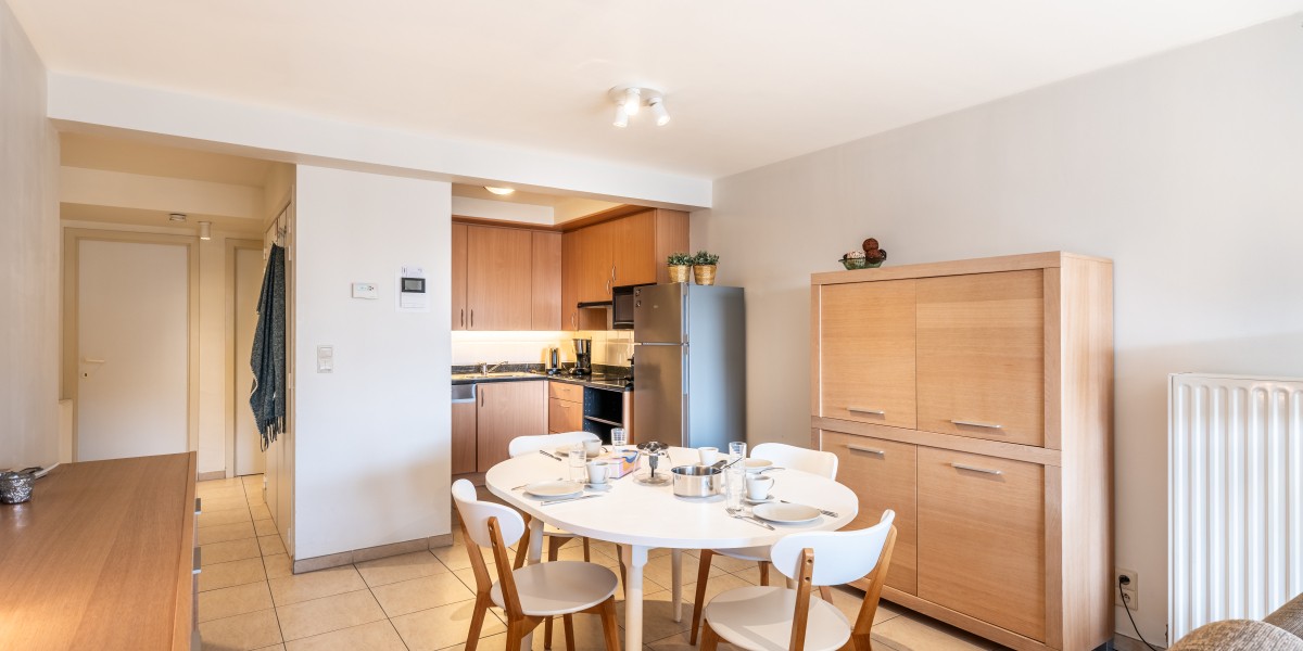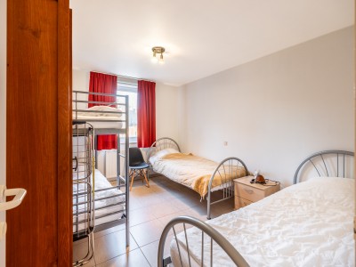 Het appartement bestaat uit inkom, toilet, badkamer met bad, slaapkamer met dubbelbed, slaapkamer met 2 éénpersoonsbedden en stapelbed, ingerichte keuken met vaatwas en microgolf, zonnige woonkamer met balkon (klein zeezicht).