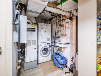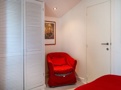 Een slaapkamer zonder raam met een stapelbed. Via deze kamer heb je toegang tot de berging met koelkast met vriesvak (3 lades), wasmachine, droogkast en ander schoonmaakmateriaal.