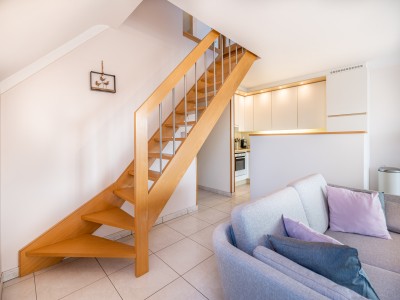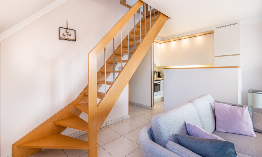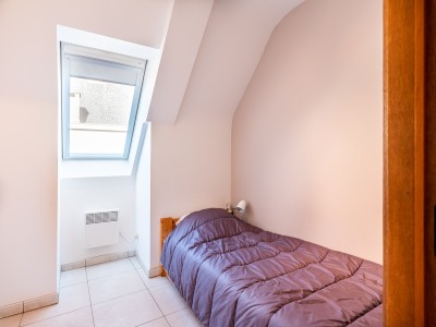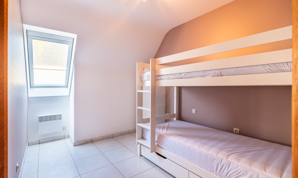 Op de 2de verdieping bevindt zich een hall met veel opbergruimte, een toilet, een zonnige woonkamer/eetkamer met open en volledig ingerichte keuken, balkon aan de woonkamer, slaapkamer met éénpersoonsbed en 1 onderschuifbed, slaapkamer tweepersoonsbed (2 matrassen voor 1 pers), slaapkamer met 1 stapelbed (2x 1 pers.)