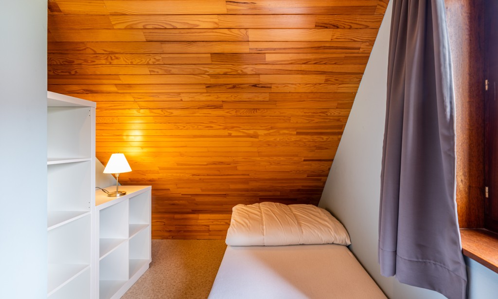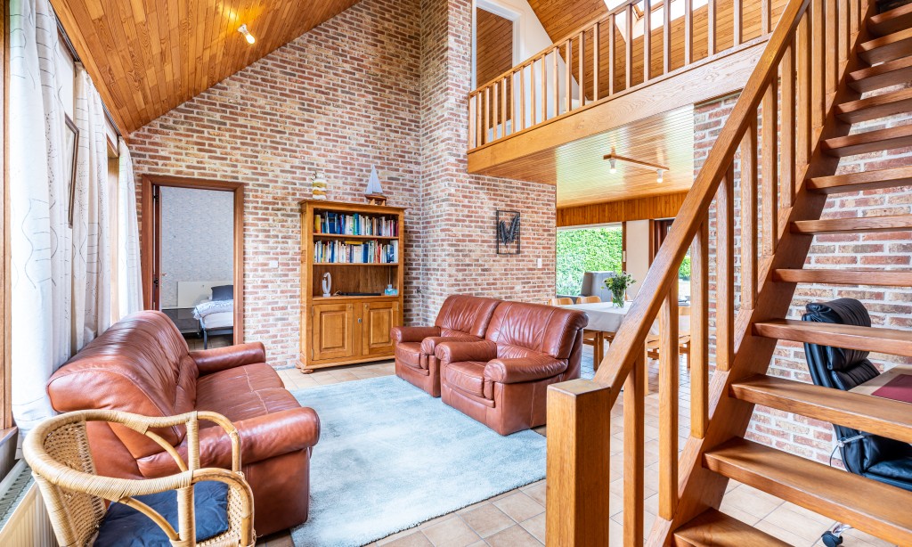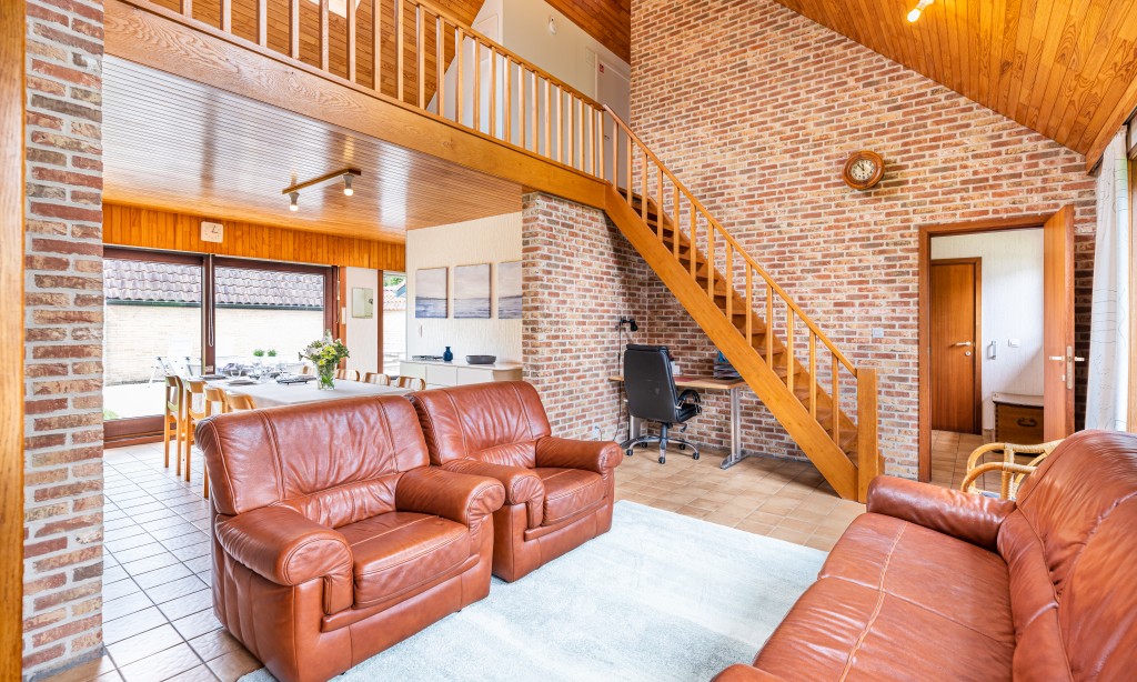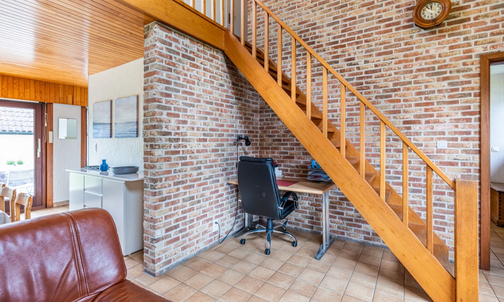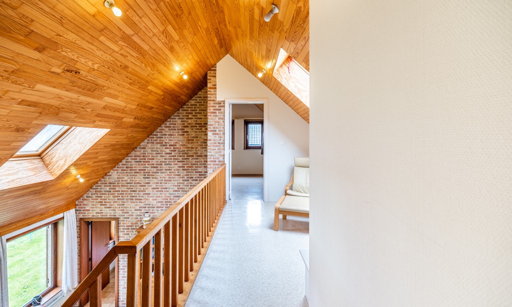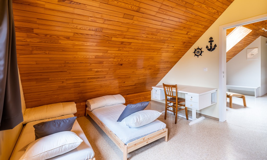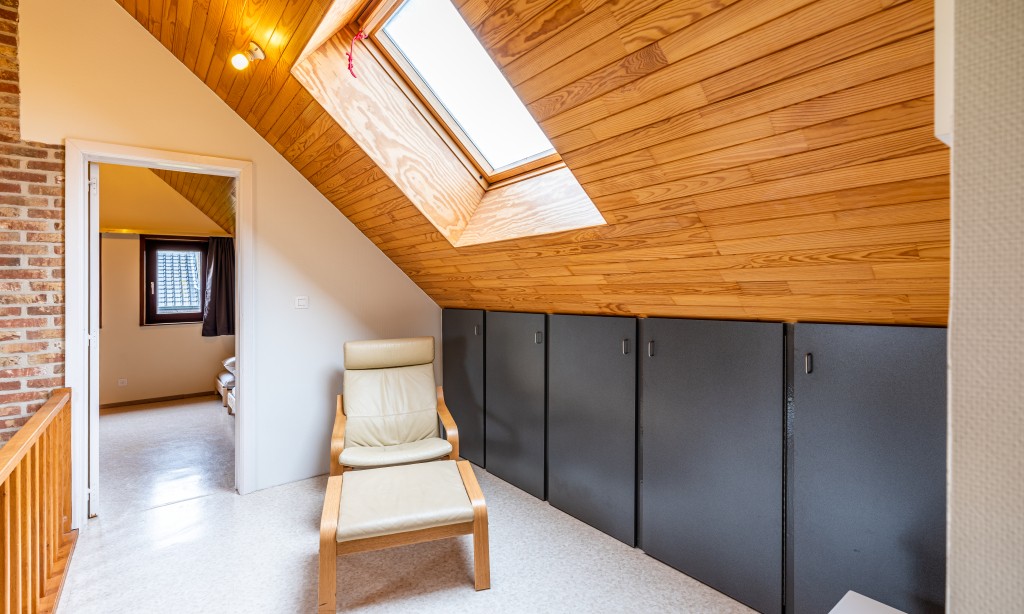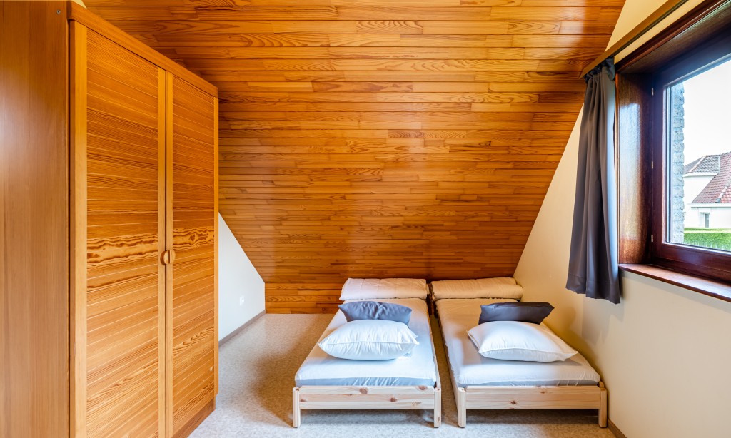 Grote overloop met veel opbergruimte ( incl kinderspeelgoed), slaapkamer met dubbel bed en 1 éénpersoonsbed, kinderslaapkamer 4 éénpersoonsbedden en bureautje. Ben je maar met 6 of 7 ? De éénpersoonsbedden in de kinderkamer zijn stapelbaar. Als je er 2 op elkaar zet, zijn de bedden niet meer zo laag.