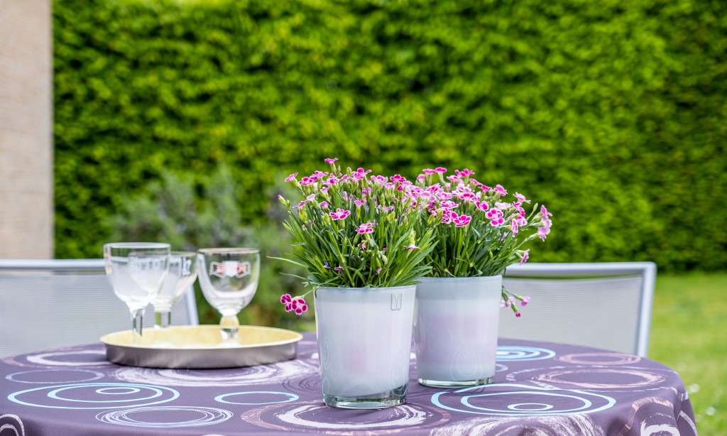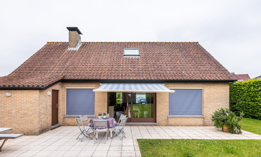 Groot betegeld terras met extra picknicktafel. Er is een elektrische zonneluifel aan de achtergevel. Er zijn elektrische “zonnescreens “aan de ramen die uitgeven op de tuin. Deze houden de woonkamer koeler in de zomer. Er zijn eveneens elektrische rolluiken aan de achtergevel en opzij.