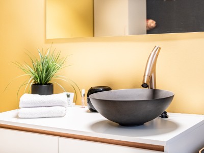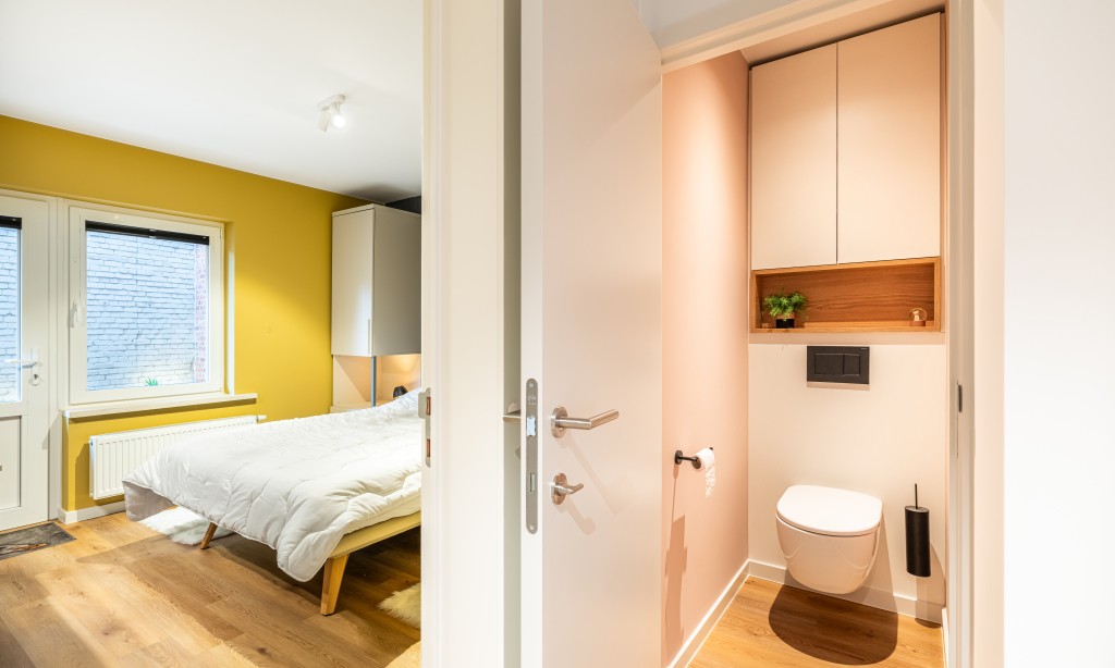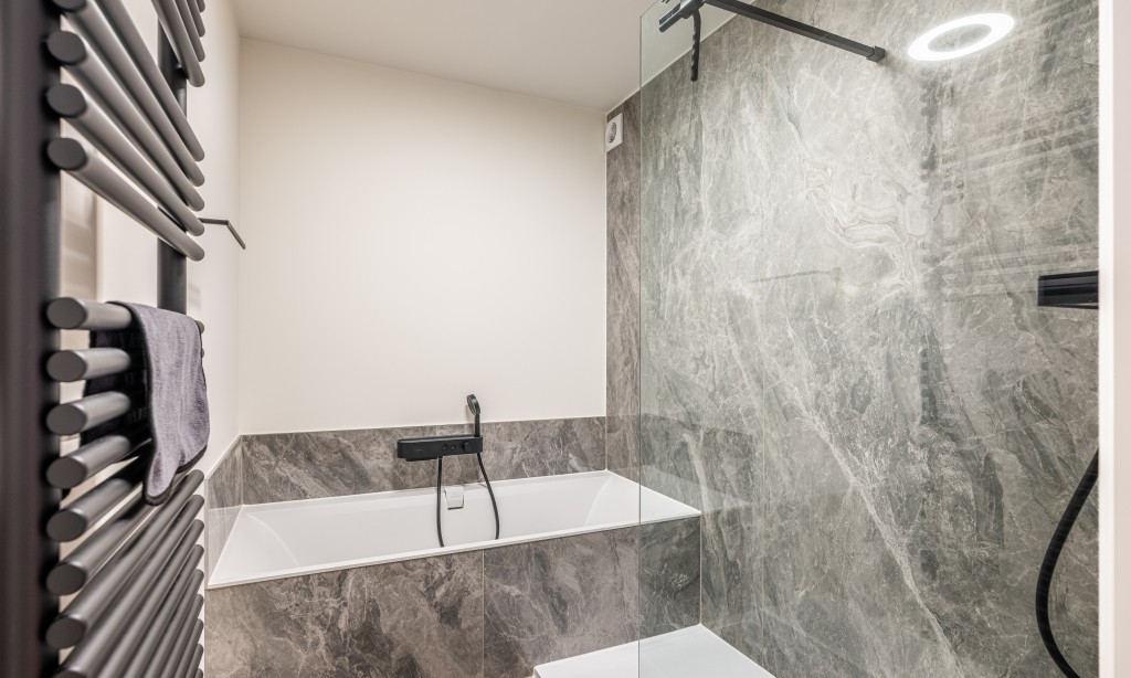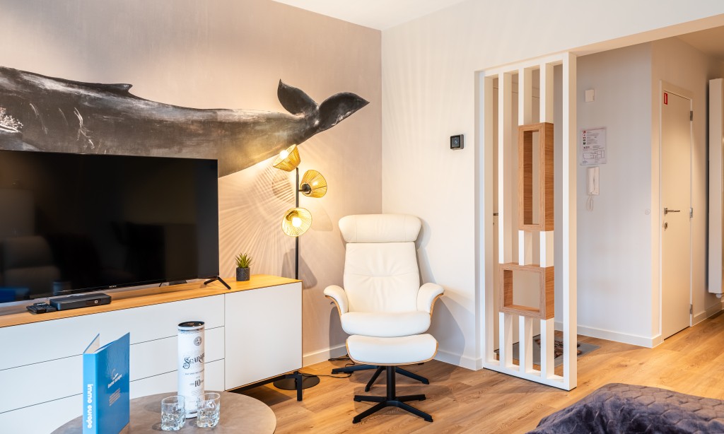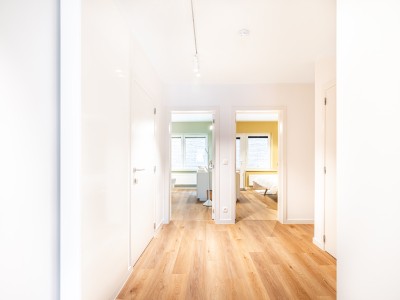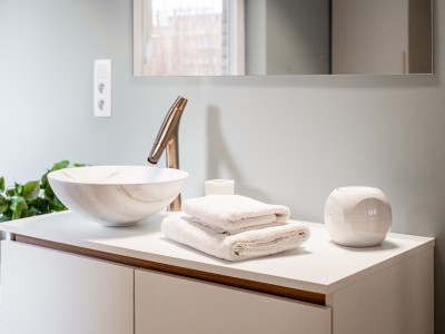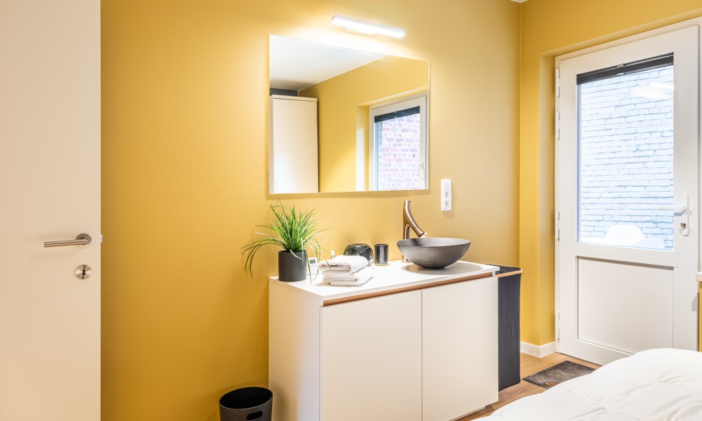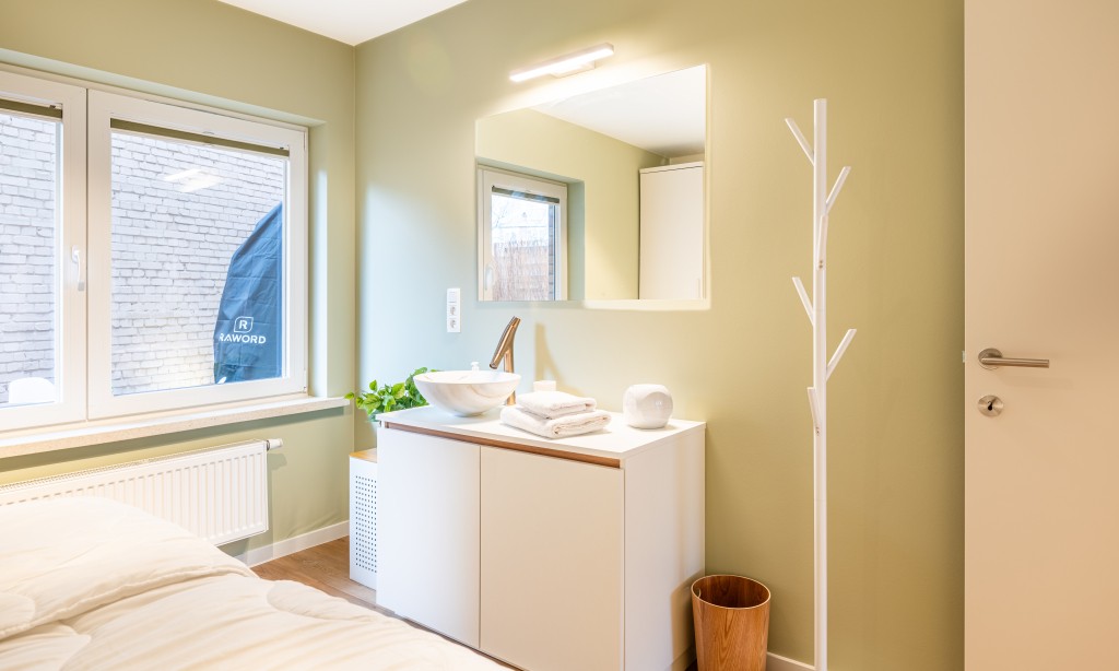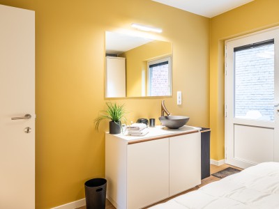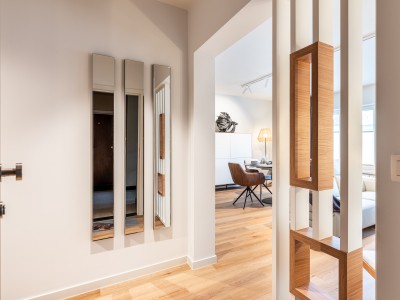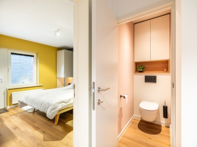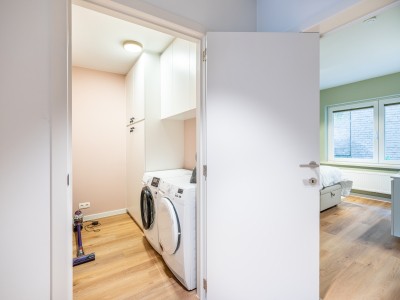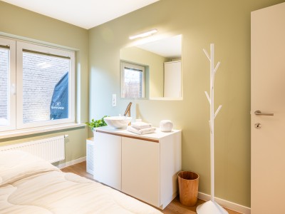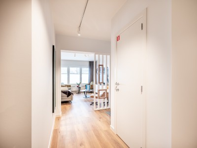 Het appartement bestaat uit een hal, een badkamer met inloopdouche en een tweepersoonsbad, een wasruimte met wasmachine, droger en droogrek, een apart toilet, twee slaapkamers, één met een tweepersoonsbed en de andere met twee eenpersoonsbedden. Elke slaapkamer heeft een wastafelmeubel en een grote spiegel.