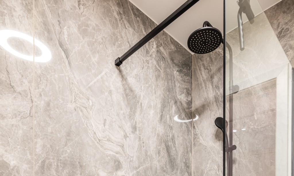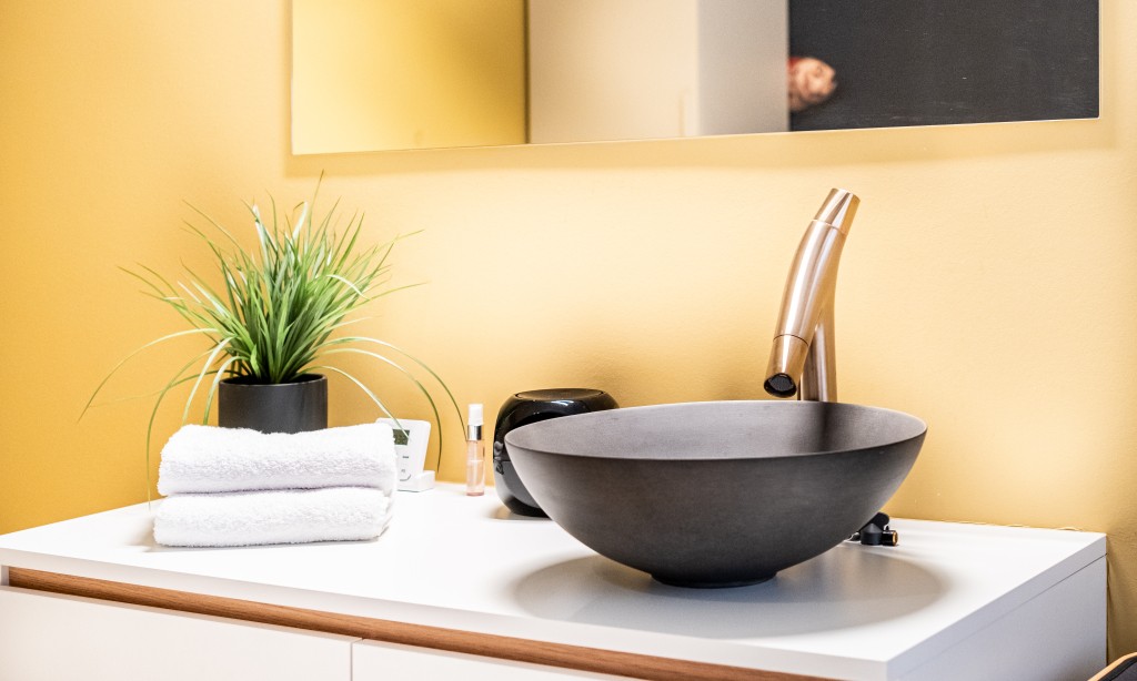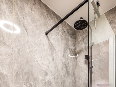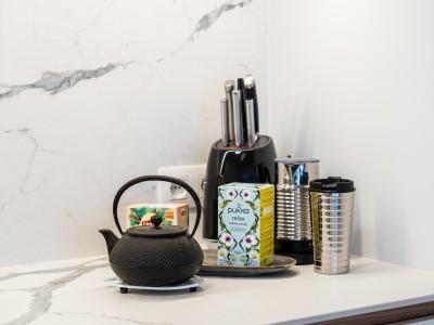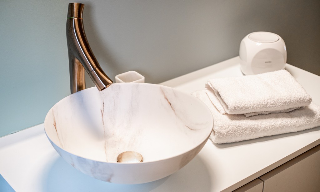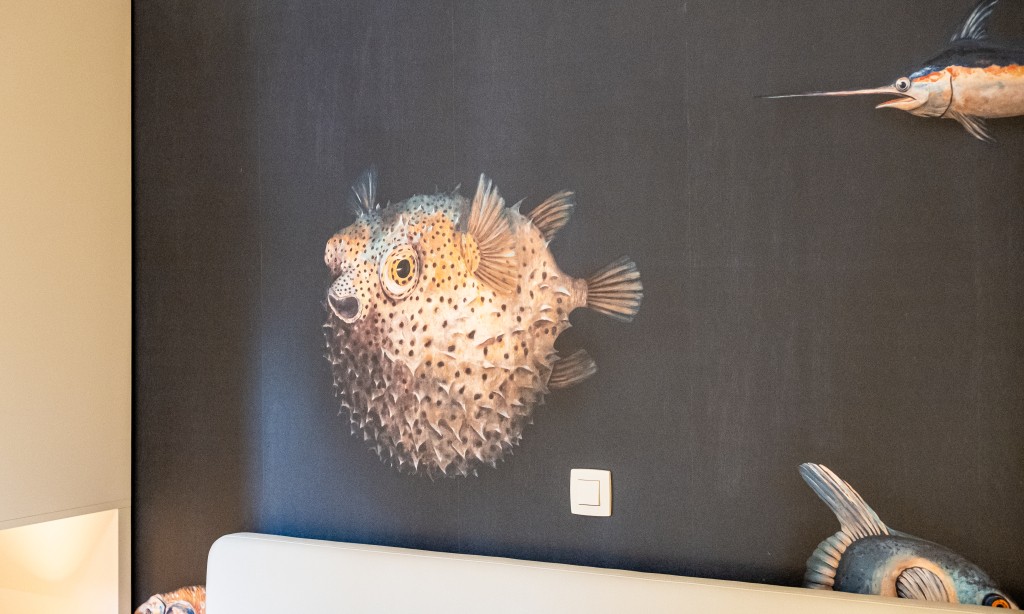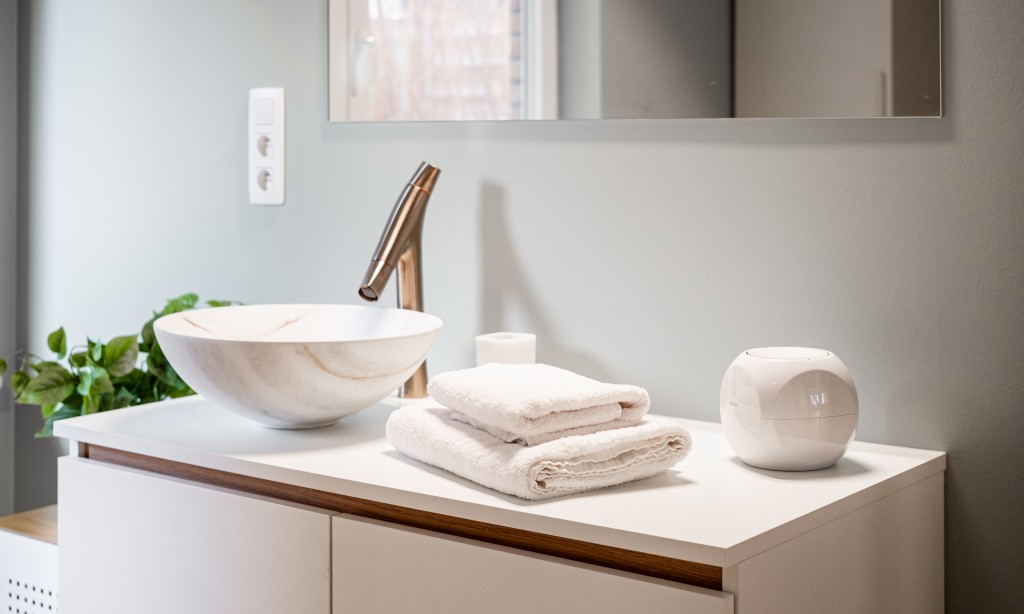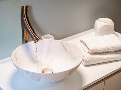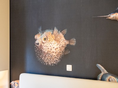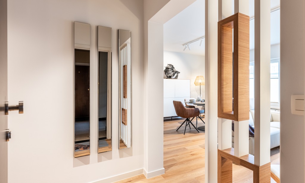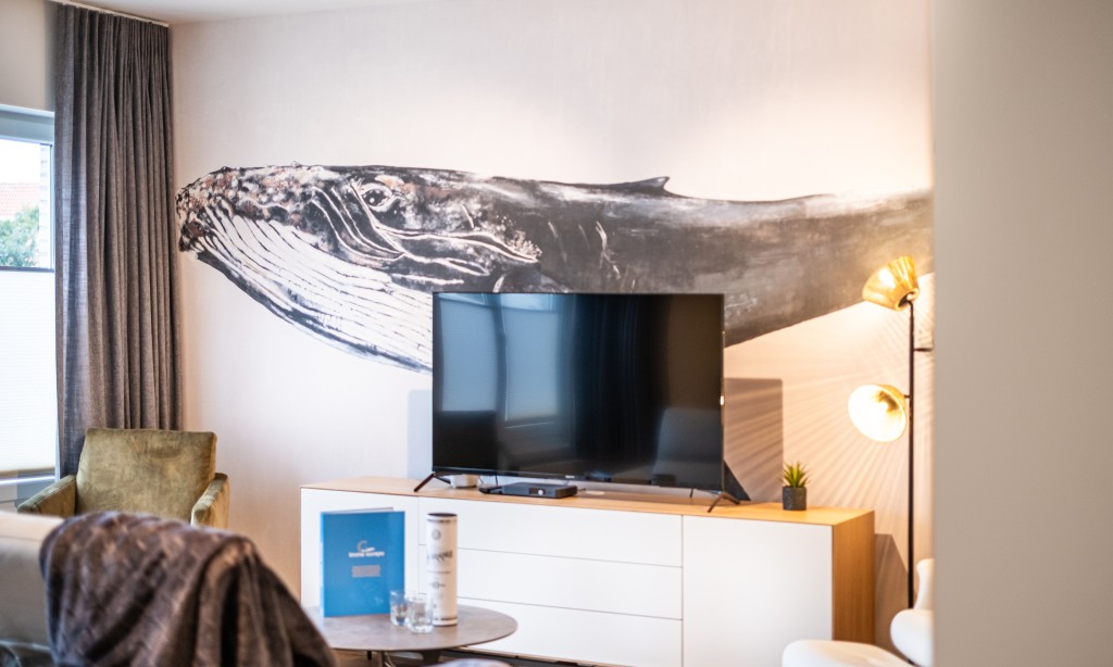 Het appartement bestaat uit een hal, een badkamer met inloopdouche en een tweepersoonsbad, een wasruimte met wasmachine, droger en droogrek, een apart toilet, twee slaapkamers, één met een tweepersoonsbed en de andere met twee eenpersoonsbedden. Elke slaapkamer heeft een wastafelmeubel en een grote spiegel.