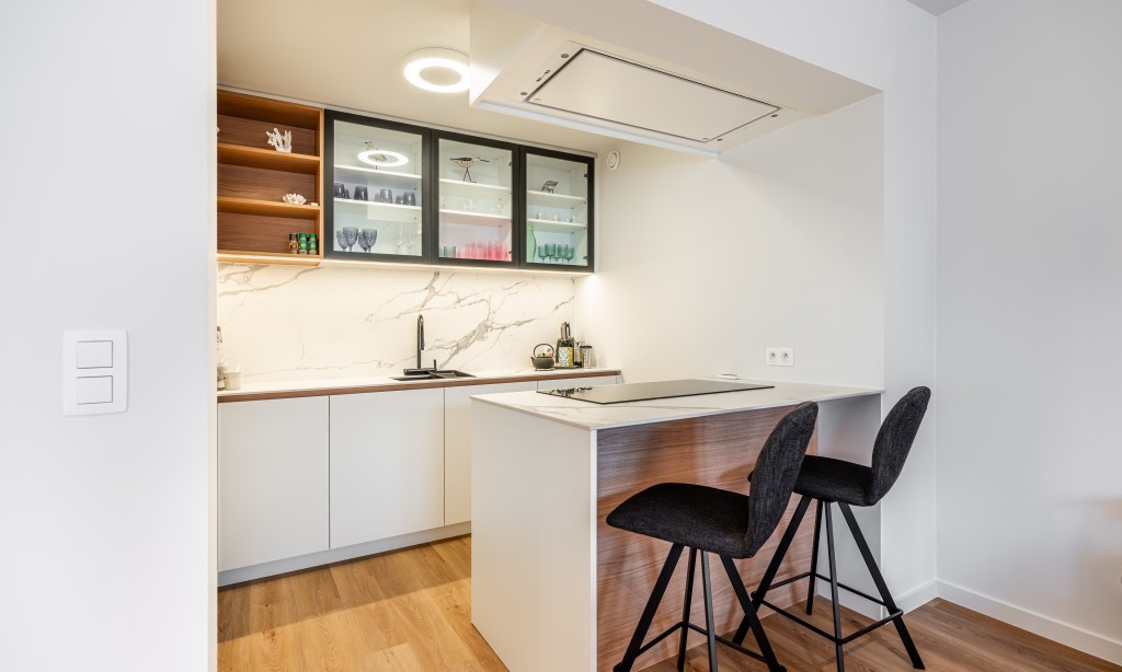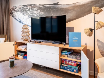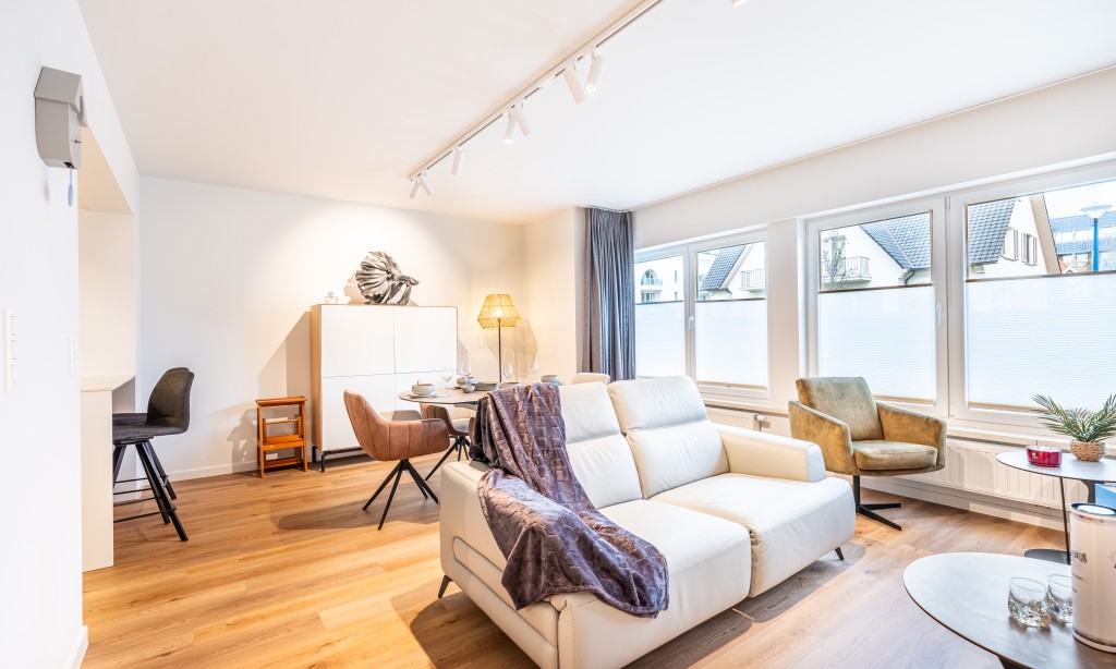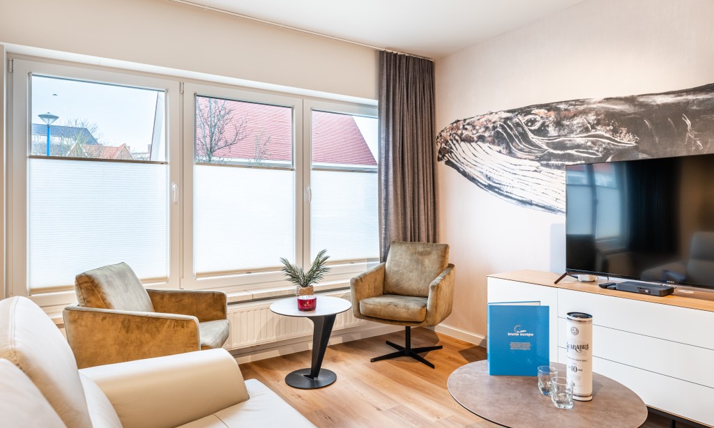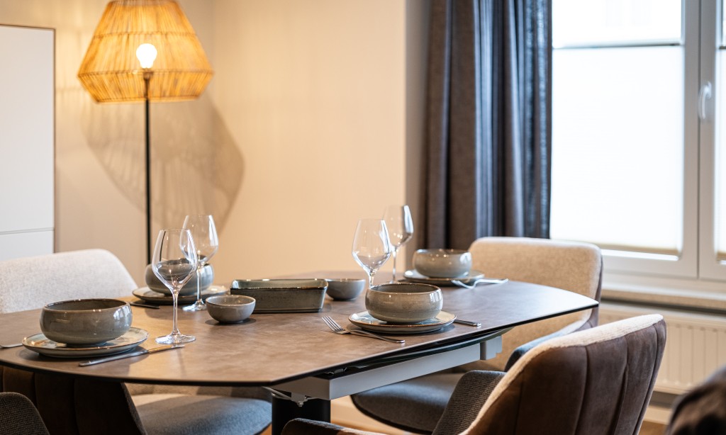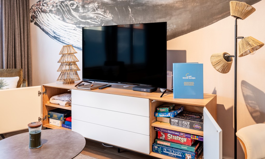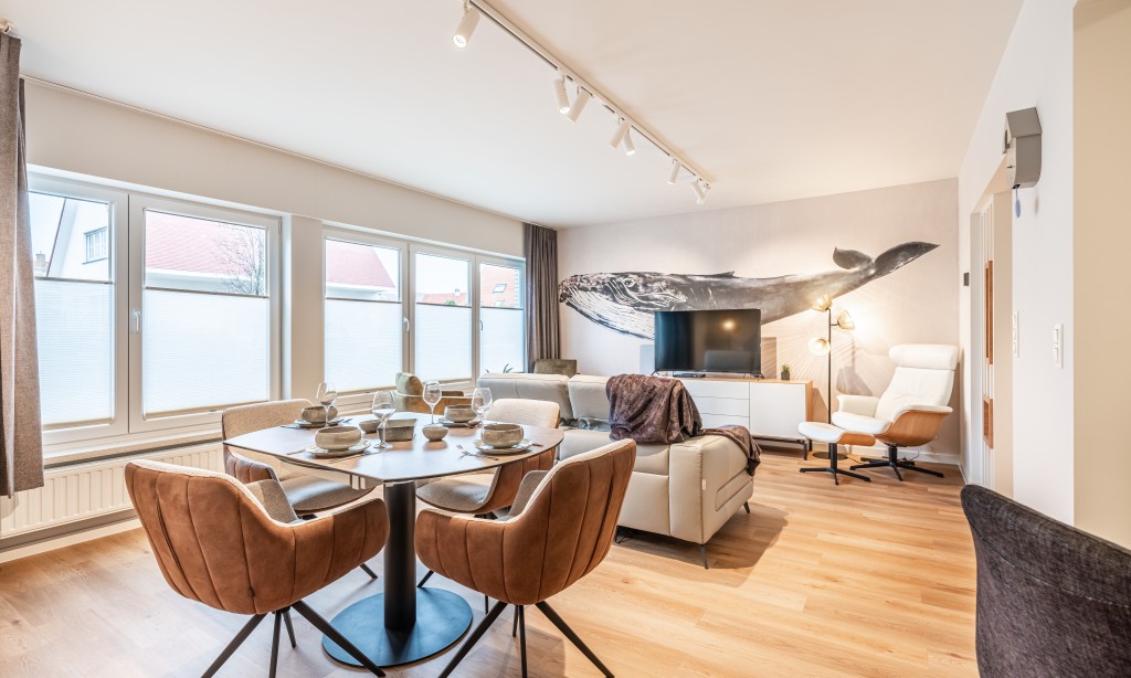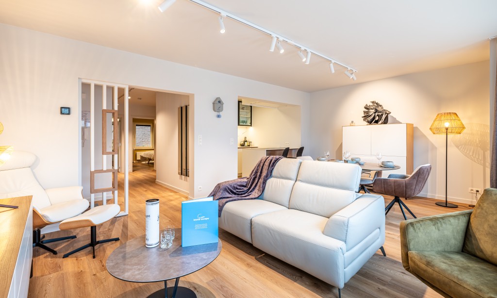 De woonkamer bestaat uit een televisie, een staande lamp, twee salontafels, een elektrische tweezitsbank, een relaxfauteuil met voetensteun en twee individuele fauteuils. De eetkamer en keuken bestaan uit een staande lamp, een tafel (uitbreidbaar) met 4 stoelen, twee barkrukken, een inductiekookplaat, een afzuigkap met afstandsbediening, een combimagnetron, een vaatwasser.