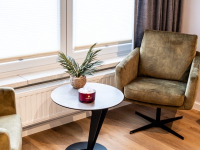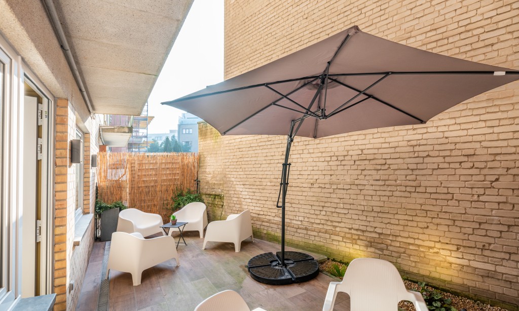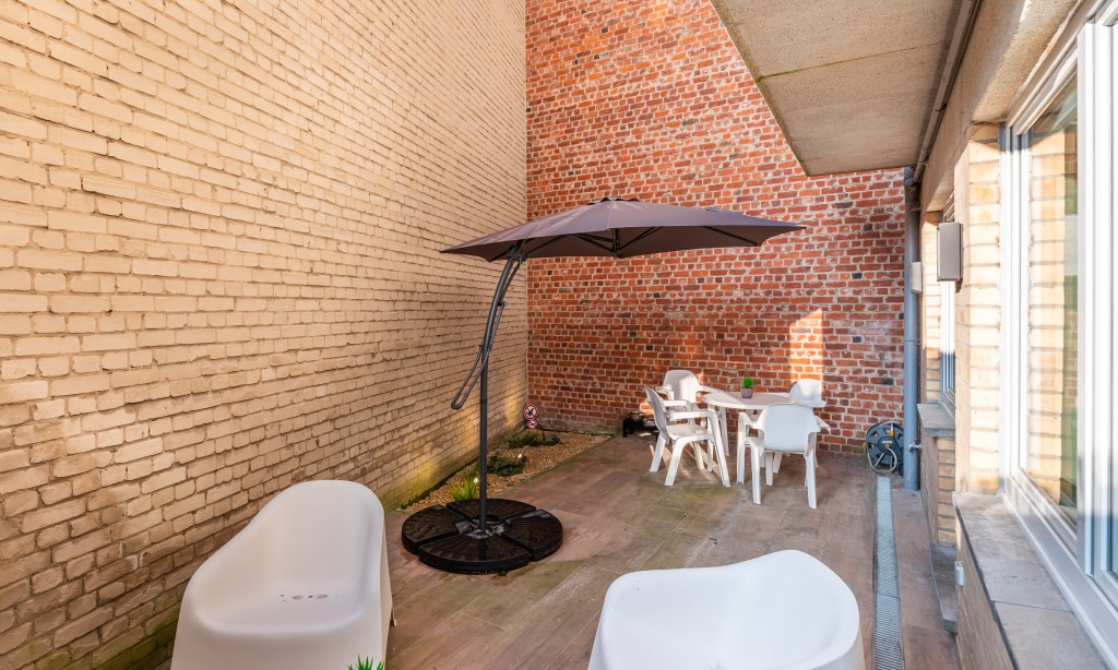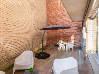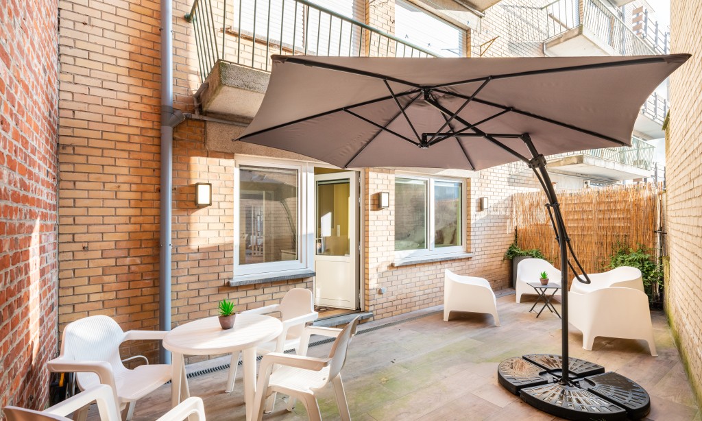 Aan de achterkant van het appartement is er een afgesloten binnenplaats met tuinmeubilair (tafel + stoelen en loungeset), een grote parasol en verlichte plantenbedden.