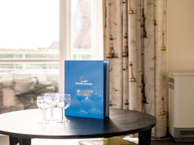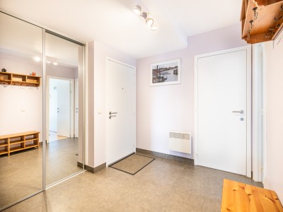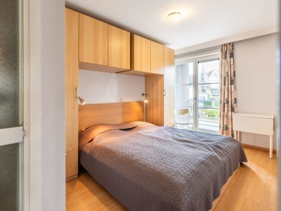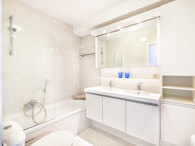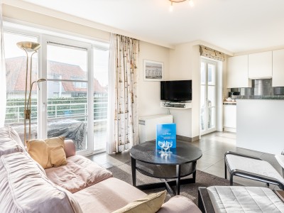 Het appartement omvat een inkomhal met apart toilet, vestiaire, woonkamer met balkon/terras rondom, open en uitgeruste keuken met keramische kookplaat, vaatwasser, gecombineerde magnetron-oven, koelkast met vriezer. Een berging met wasmachine, droger, strijkijzer, strijkplank, droogrek. Eethoek met tafel en 8 stoelen, 2 stoelen + poef (Ikea Pello-model), slaapbank voor 2 personen in de woonkamer, slaapkamer met tweepersoonsbed en eigen aangrenzende badkamer met douche, 2e slaapkamer met stapelbed en uitschuifbare lattenbodem + matras voor één persoon, 3e slaapkamer met 2 eenpersoonsbedden naast elkaar, 2e badkamer met bad, toilet en wastafel.