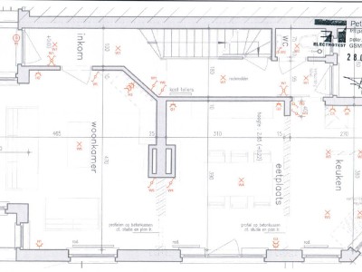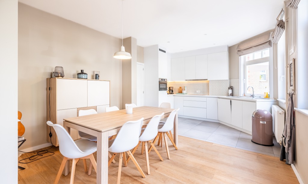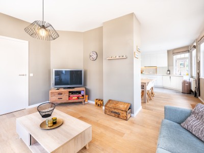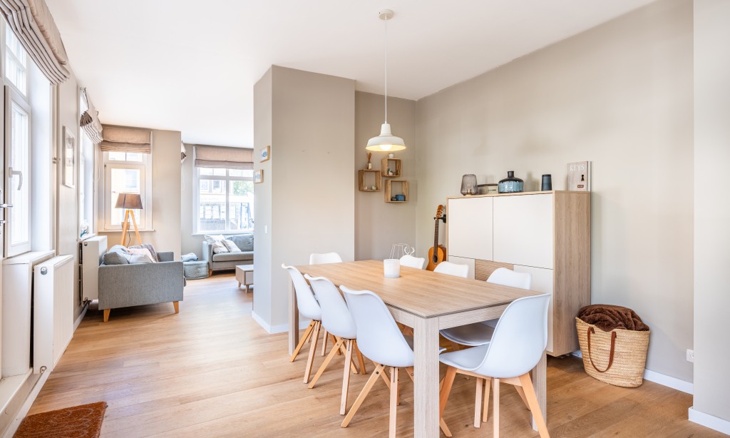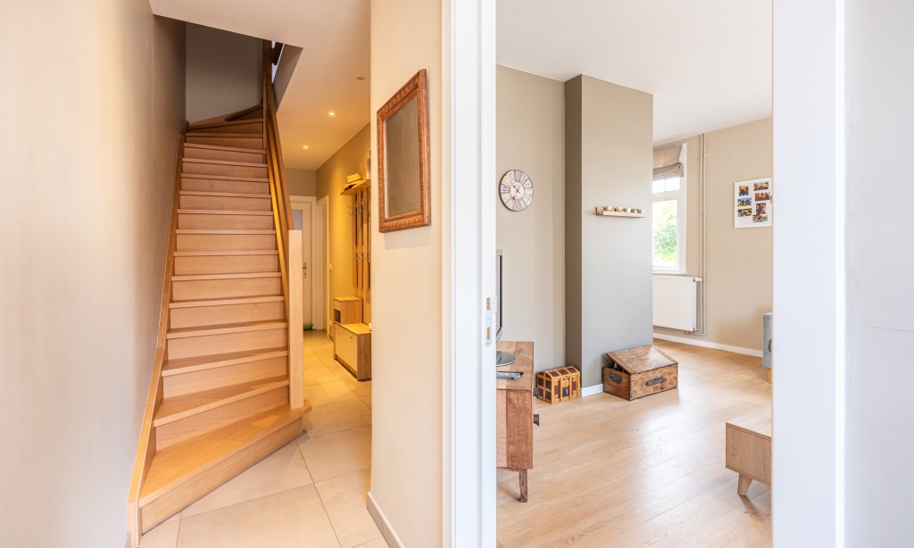 Hal met trap, woonkamer en eetkamer, volledig uitgeruste open keuken en een toilet.
