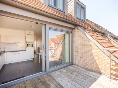 Op de 4de verdieping bevindt zich de hal, toilet, aparte goed uitgeruste keuken met eettafel en toegang tot het terras aan de kant van de Zeelaan (zon in de ochtend), de woonkamer met hoeksalon en toegang tot het 2de terras (zon in de middag). Er is ook een berging met wasmachine en droogkast. In de woonkamer is de trap die je naar de bovenverdieping brengt.