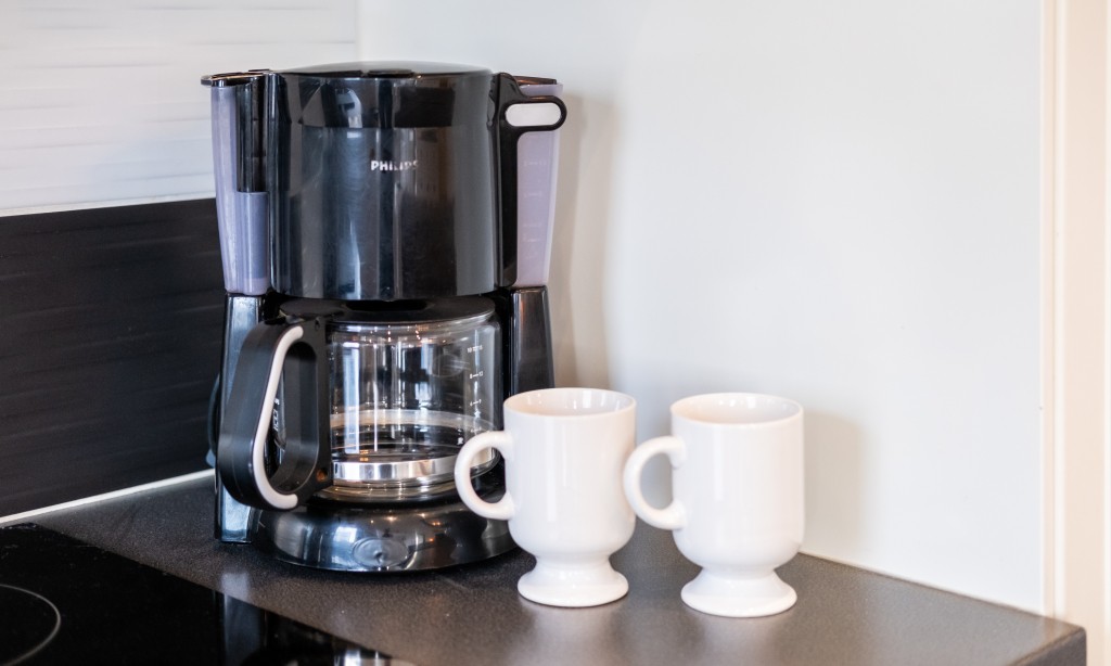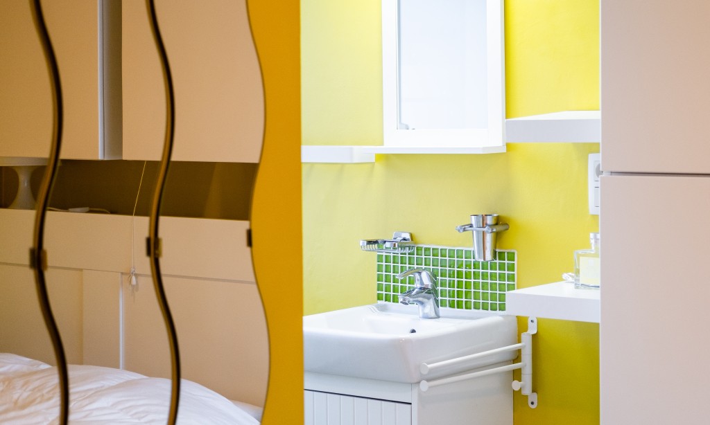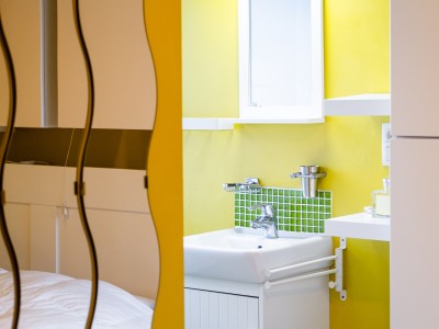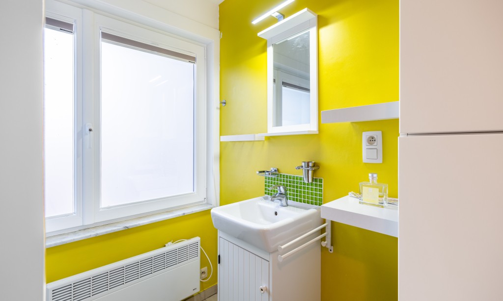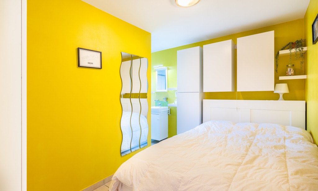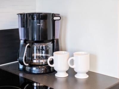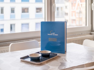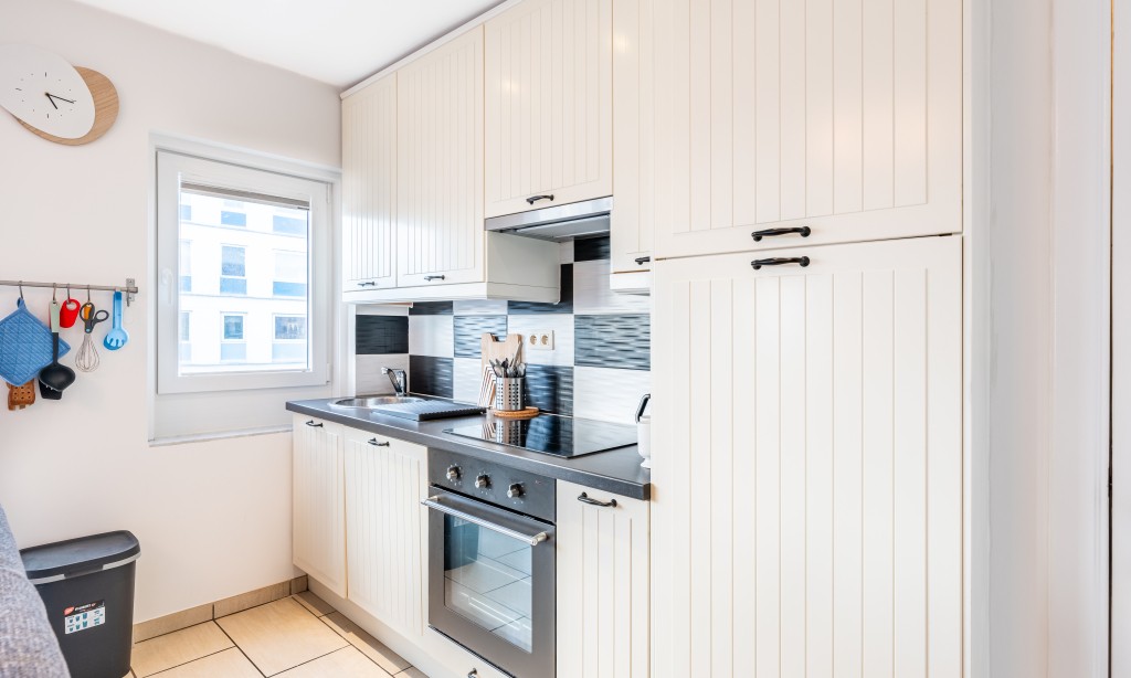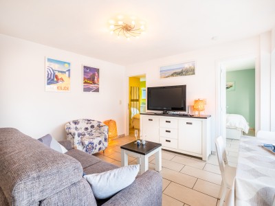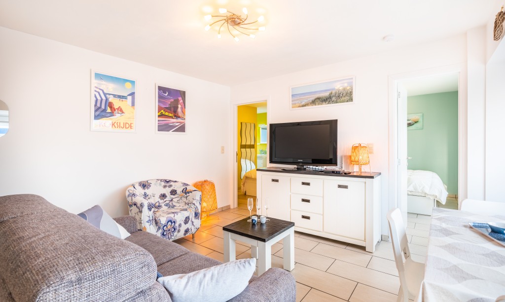 Zonnige woonkamer met open, volledig ingerichte keuken, comfortabele bank en fauteuil, tafel en 4 stoelen. De flat heeft een apart toilet, 2 slaapkamers met elk een tweepersoonsbed, wastafel en douche.