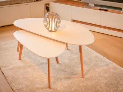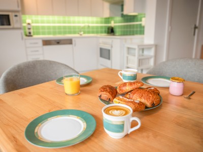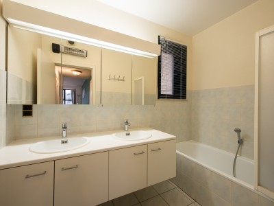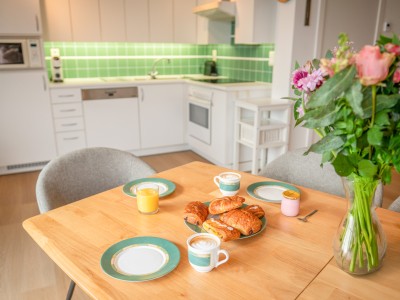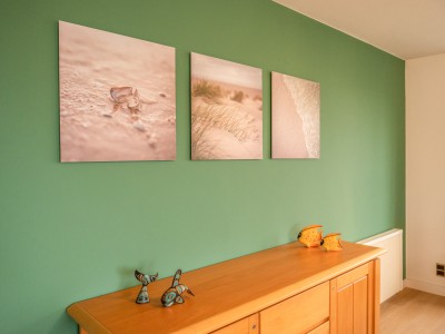 Inkomhal die uitgeeft in de zonnige woonkamer met tv-hoek, eethoek en open ingerichte keuken met toegang tot het balkon. Er is een slaapkamer met een 2-persoonsbed e een slaapkamer met een stapelbed voor 3 personen (dubbel bed onderaan en enkel bed bovenaan). De badkamer bestaat uit 2 lavabo’s in een badkamermeubel en een bad met douchewand. Er is een afzonderlijk toilet. Het appartement is ook voorzien van een leesbank tegen het raam en voor de allerkleinste is een kinderbed en kinderstoel voorzien.