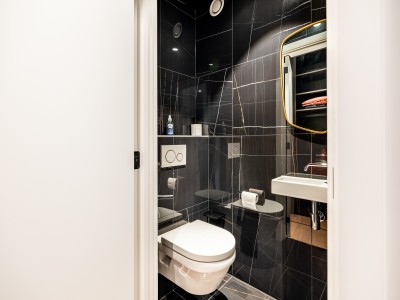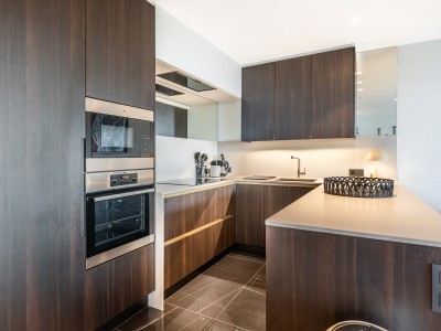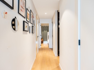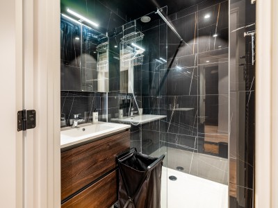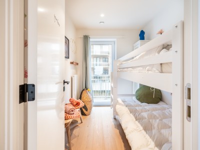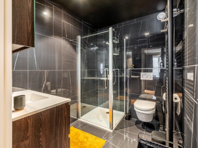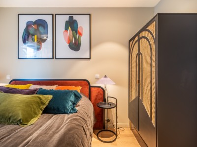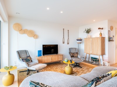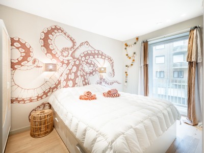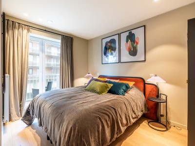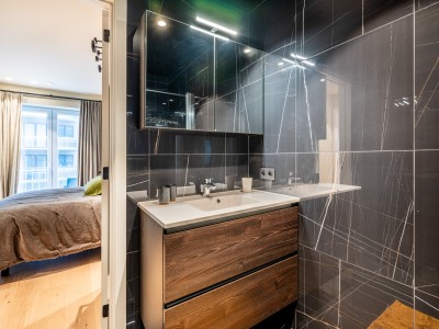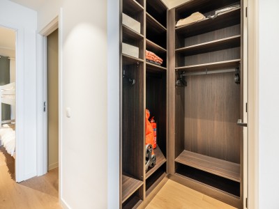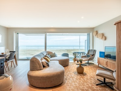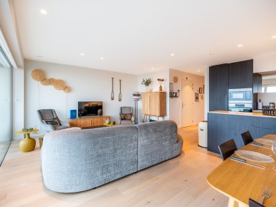 Dit ruime appartement bestaat uit een hal met een grote dressing/garderobe; ruime woonkamer met high-end meubelen, grote hoekbank, tafel en stoelen; open keuken met vaatwasser, oven, magnetron, koelkast met 2 diepvriesladen; badkamer met Italiaanse douche, apart toilet; 2 slaapkamers met 1 tweepersoonsbed, waarvan 1 met eigen doucheruimte met toilet, 1 slaapkamer met 1 stapelbed. Balkon aan voor- en achterzijde.