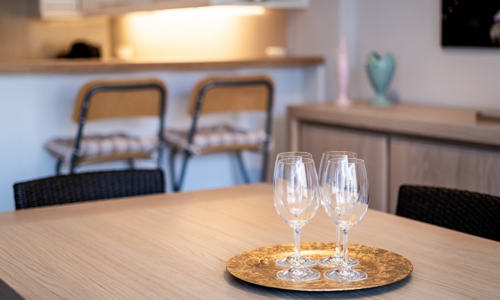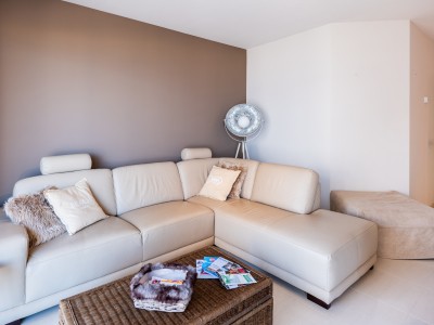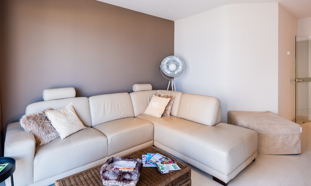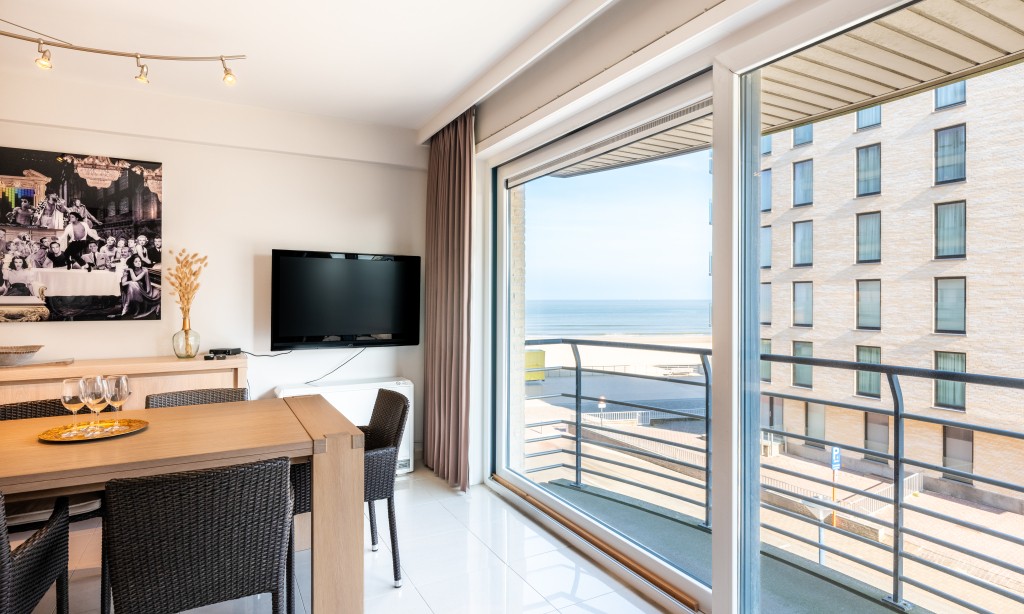 Inkomhal met vestiaire, berging met wasmachine, apart toilet, woonkamer met eettafel en 6 stoelen, comfortabele hoekzetel en een opklapbed voor 1 persoon. Toegang tot het balkon met zeezicht.