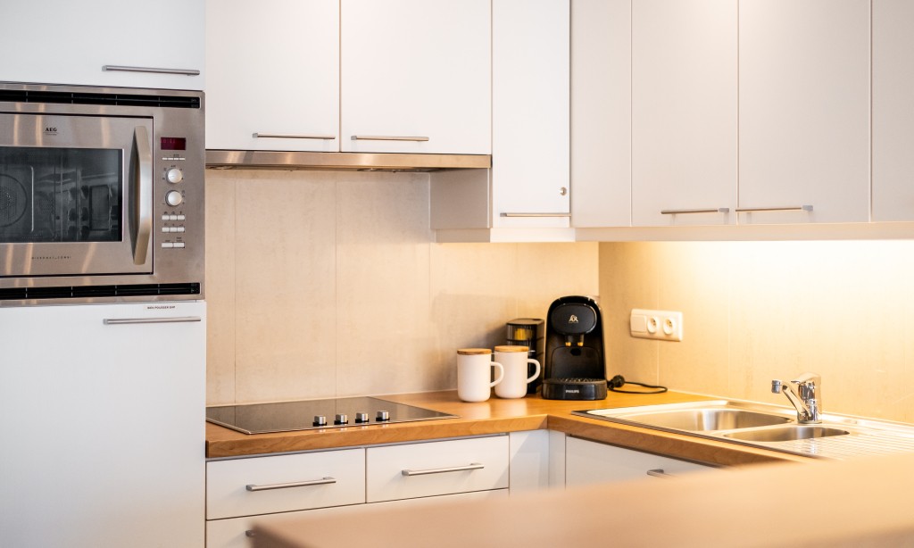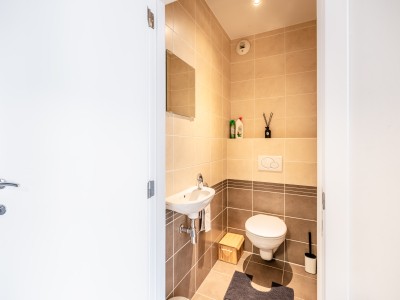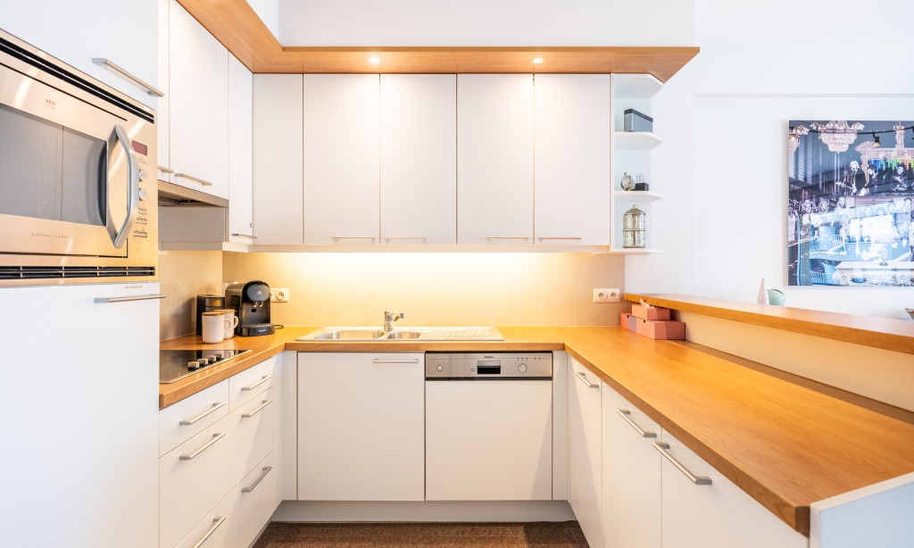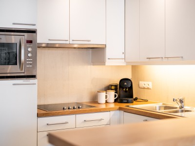 De keuken is uitgerust met een koelkast, combi-microgolfoven en vaatwasser. Badkamer met wastafel en bad.