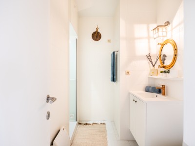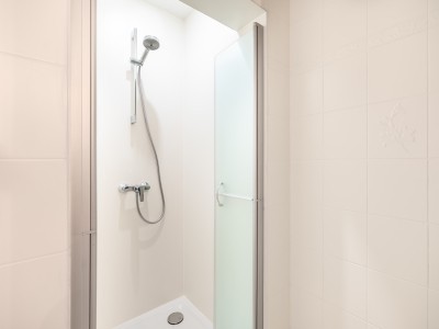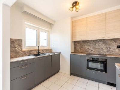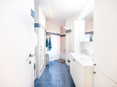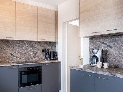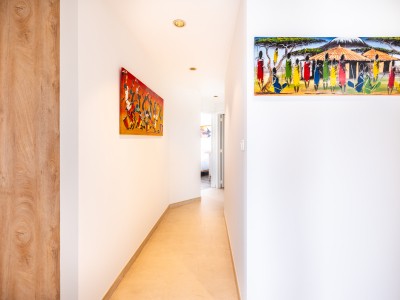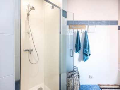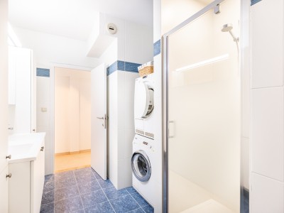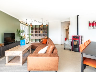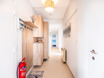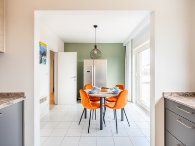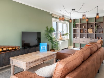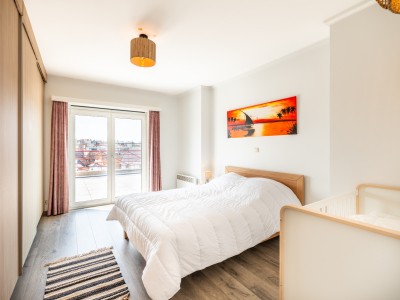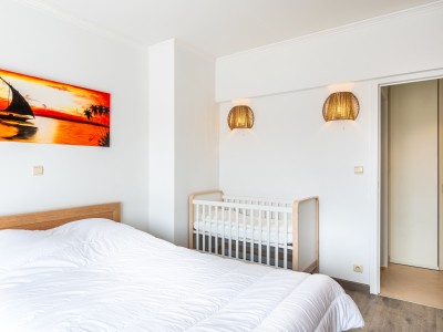 Dit ruime appartement bestaat uit een hall, grote eetkamer - woonkamer met design meubilair, toegang tot het terras, leeshoek in de woonkamer. De afzonderlijke keuken met vaatwas, combi-microgolf, elektrische kookplaat en Amerikaanse koelkast heeft ook een eethoek voor 4 personen. Vanuit de keuken kan je ook op het terras en kan je je ontbijt buiten nemen. Er zijn 3 slaapkamers. Een kamer met een stapelbed en 1 eenpersoonsbed (90x200, 3 éénpersoonsdekbedden 140x200), een slaapkamer met een dubbel bed , een slaapkamer met een dubbel bed en een babybed met verhoogbare bodem voorzien van matras, kussen en dekbed. Er is 1 afzonderlijk toilet, 1 toilet in de badkamer,1 badkamer met douche, 1 badkamer met bad en douche.