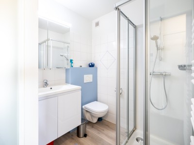 Hall, woonkamer met frontaal zeezicht, aparte ingerichte keuken, badkamer met douche, een divanbed voor 2 personen en opklap bed voor 2 personen.