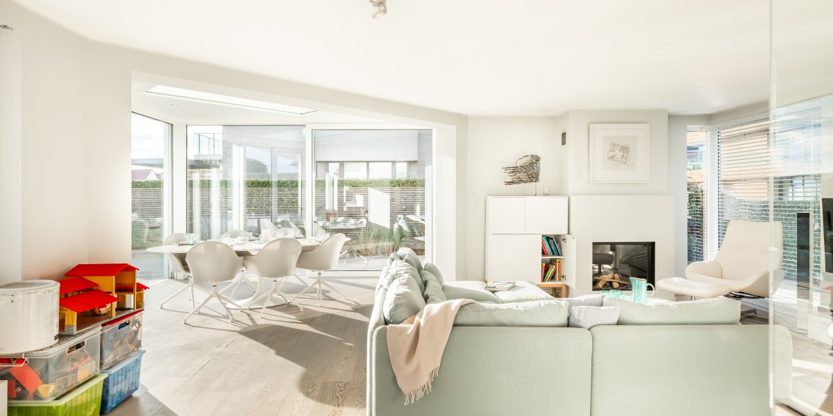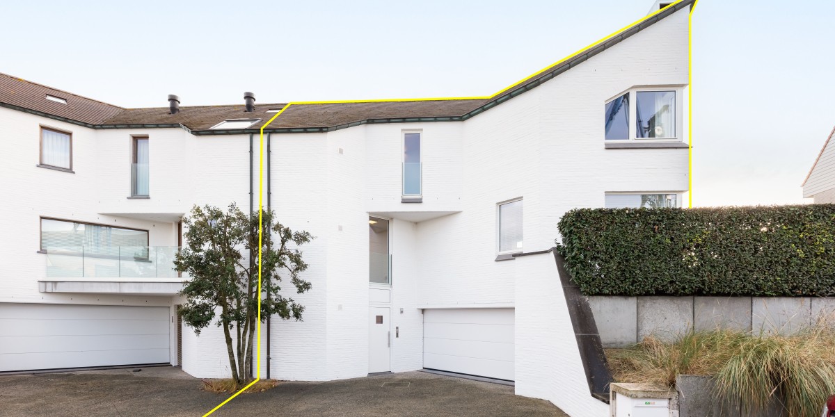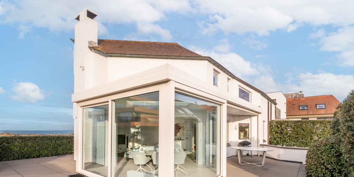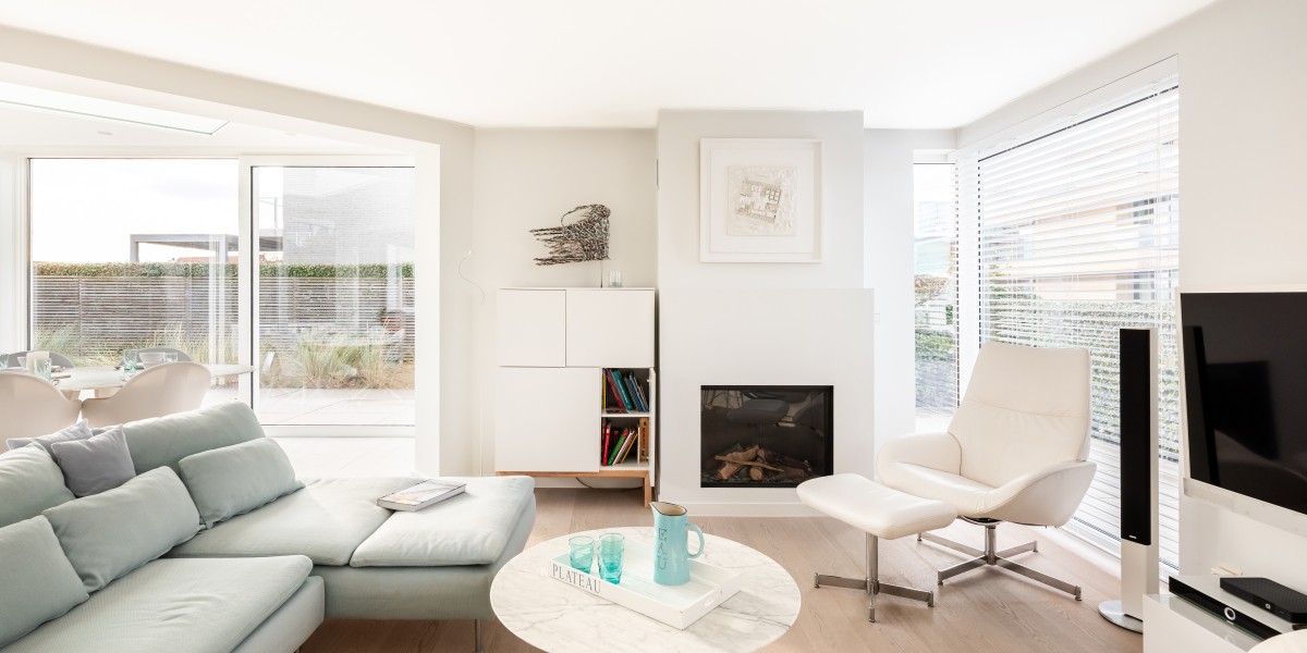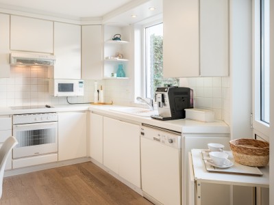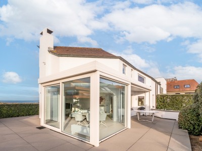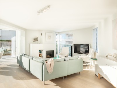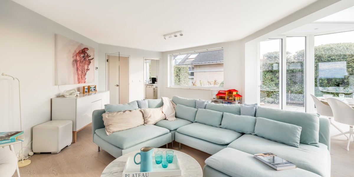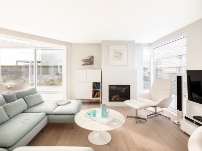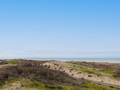 Hal, toilet, woonkamer met grote hoekzetel, flatscreen tv, gezellige gashaard en duinen- en zeezicht, eethoek met grote tafel 8 stoelen. Toegang tot het ruime zonnige terras. Op het terras staat ook een grote tafel, 8 stoelen en gasbarbecue. Er is een parasol voorzien in de berging van de keuken. De keuken is uitgerust met een elektrische kookfornuis, microgolf oven, gewone oven, vaatwas.