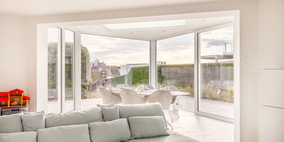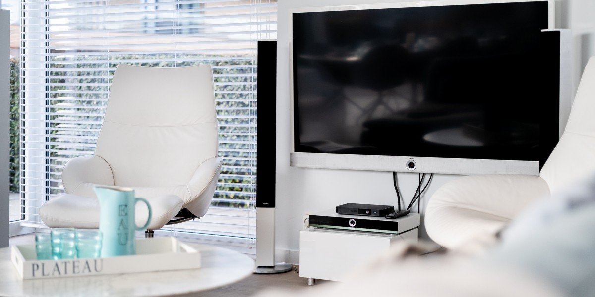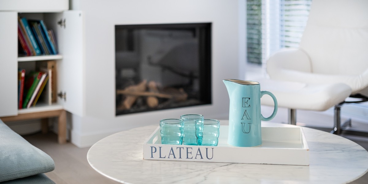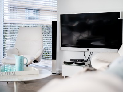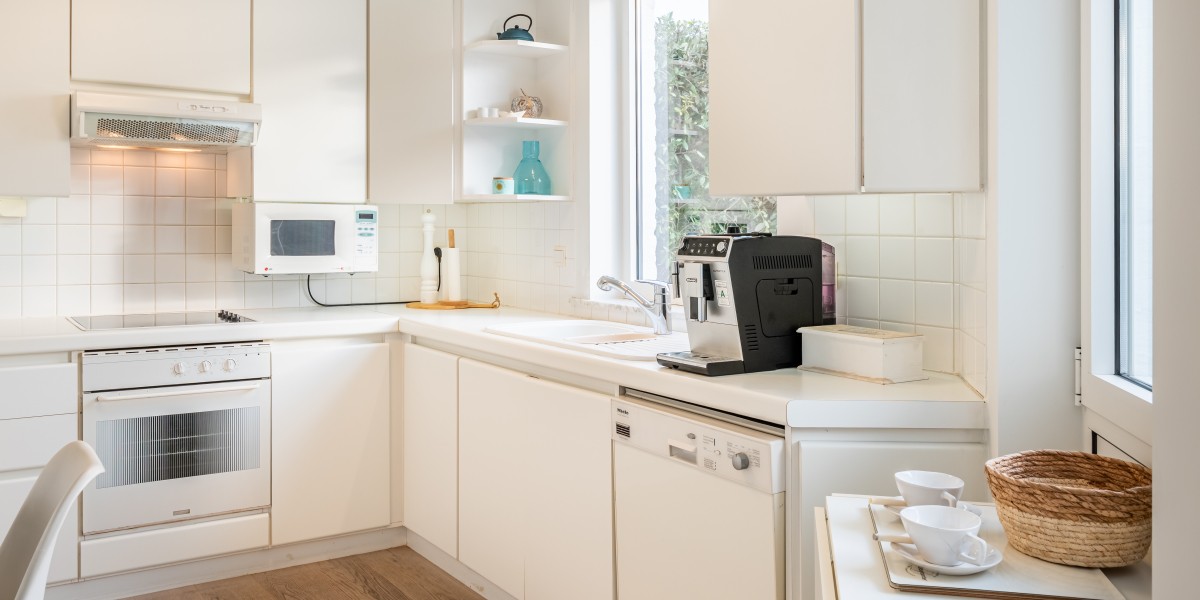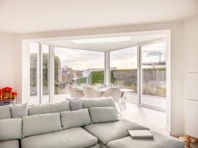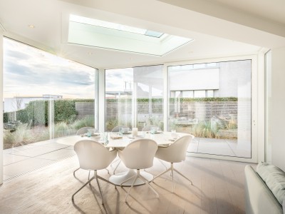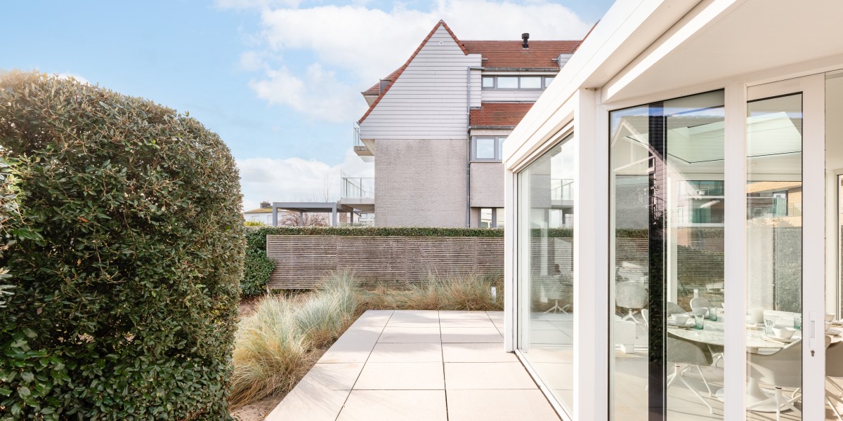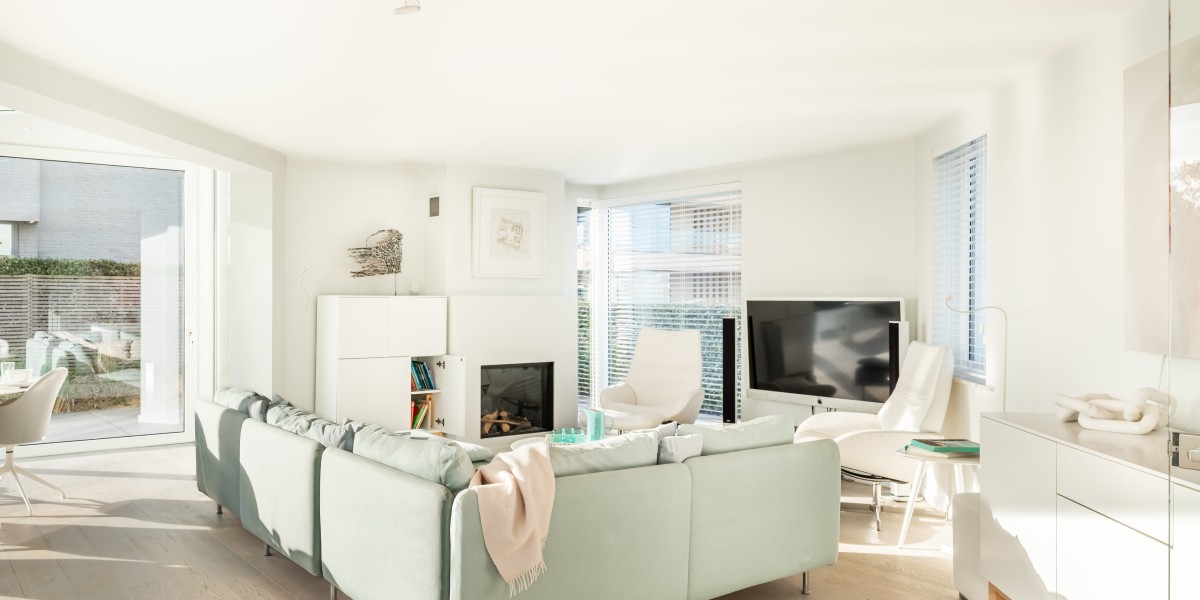Hal, toilet, woonkamer met grote hoekzetel, flatscreen tv, gezellige gashaard en duinen- en zeezicht, eethoek met grote tafel 8 stoelen. Toegang tot het ruime zonnige terras. Op het terras staat ook een grote tafel, 8 stoelen en gasbarbecue. Er is een parasol voorzien in de berging van de keuken. De keuken is uitgerust met een elektrische kookfornuis, microgolf oven, gewone oven, vaatwas.