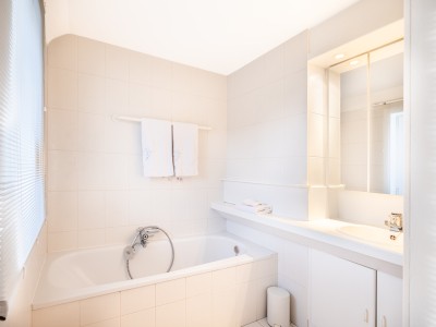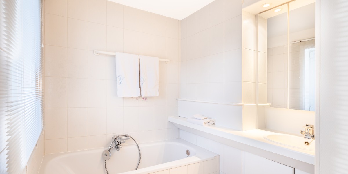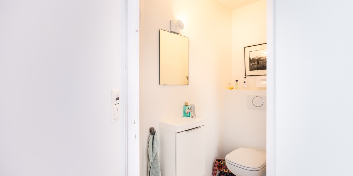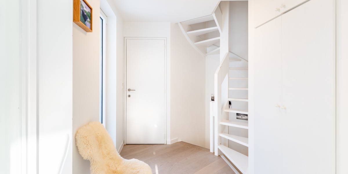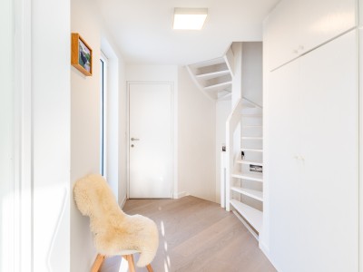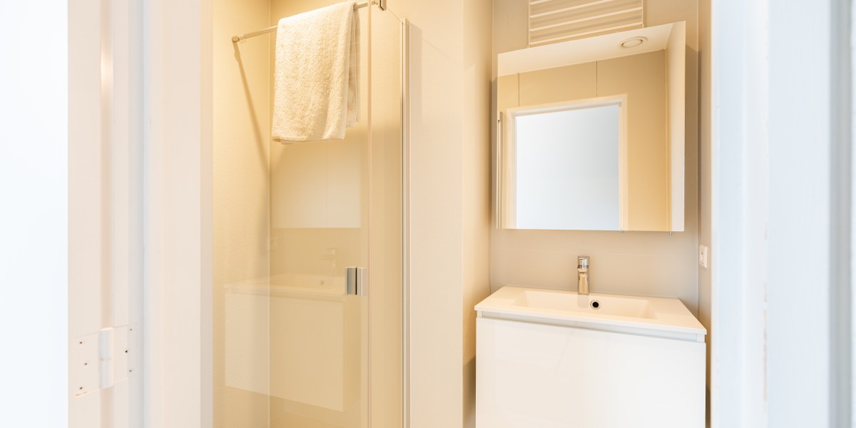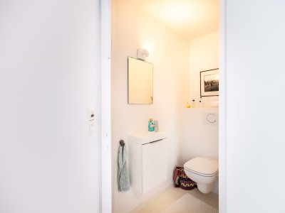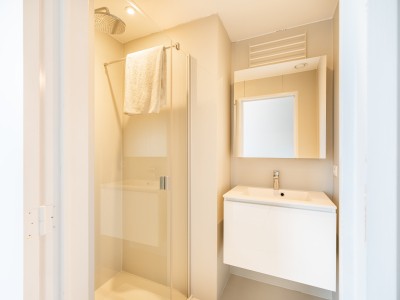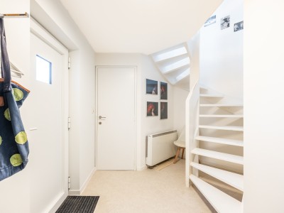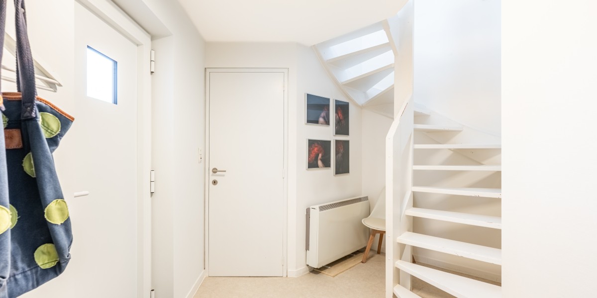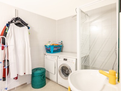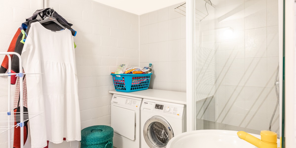 Een inkomhal, toilet, badkamer met douche / wasmachine / droogkast. Toegang tot de garage die dienst doet als grote berging voor uw fietsen, surf- en strandspullen. Er staat hier ook een extra koelkast met groot vriesvak.