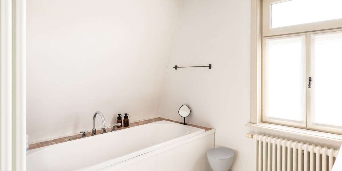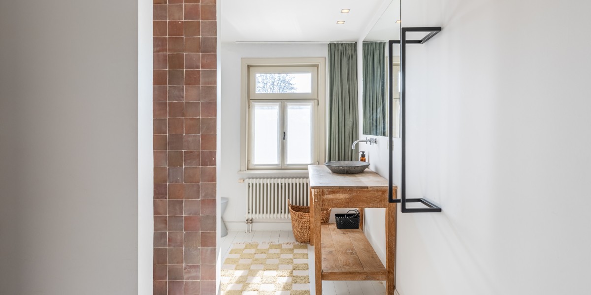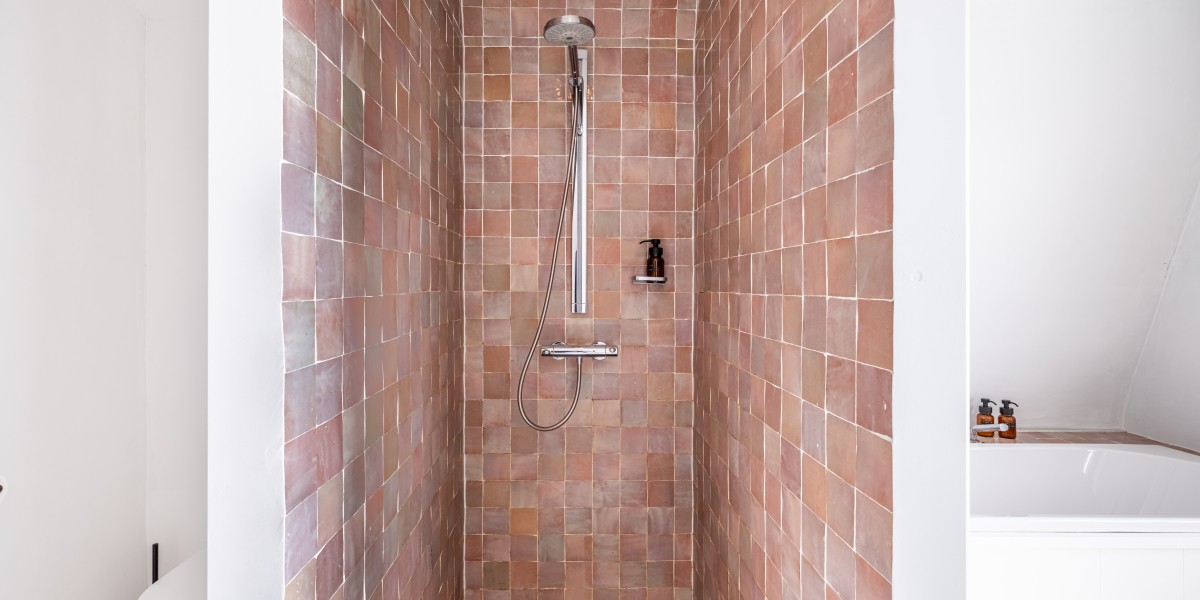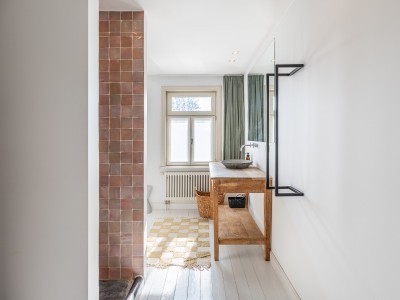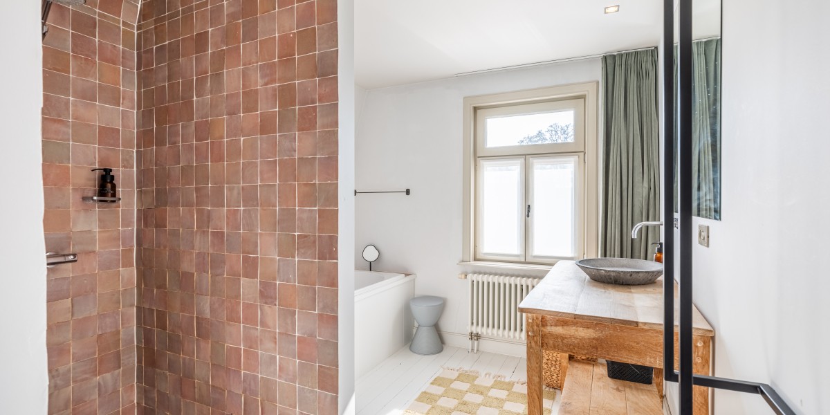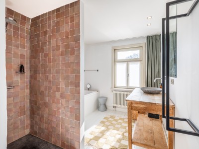 Badkamer met inloopdouche, ligbad en toilet.