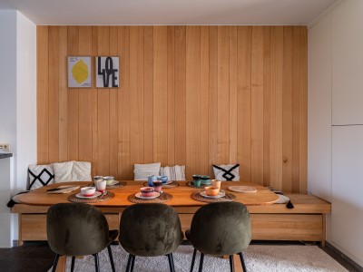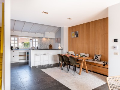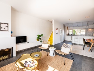 Hall met afzonderlijk toilet, lichtrijke zitkamer met comfortabele zetel (zetelbed met volwaardige matras voor 2 personen), eethoek en open ingerichte keuken met zicht op de tuin en toegang tot het terras.