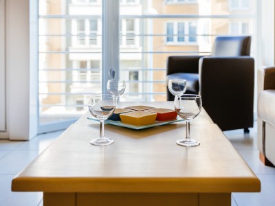 Het appartement bestaat uit een woonkamer met zeezicht, open ingerichte keuken, badkamer met douche en 2 slaapkamers waarvan één met dubbelbed en één met een stapelbed. Er is ook nog een divanbed in de woonkamer.