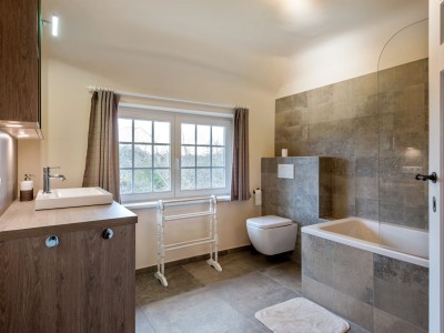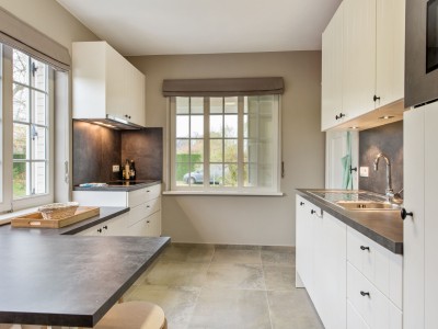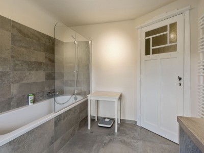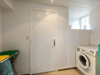 Hall, woonkamer/eetkamer, volledig ingerichte keuken, 3 slaapkamers, badkamer met bad en douchewand, toilet. Er is ook een toilet op het gelijkvloers.