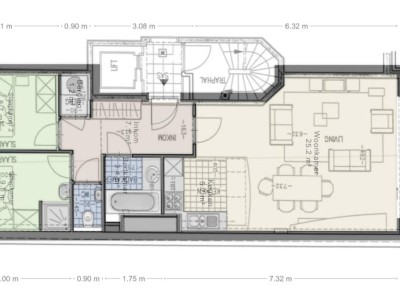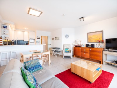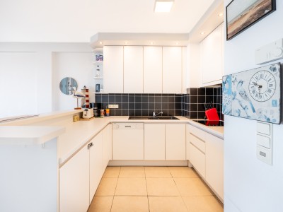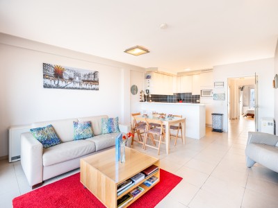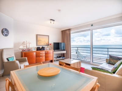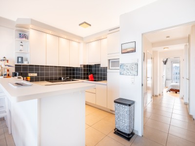 Modern 2 kamer appartement op de 6de verdieping op de Zeedijk in Koksijde. Het appartement bestaat uit hall, woonkamer met zeezicht en open volledig ingerichte keuken, digitale tv, Wifi, 2 slaapkamers, apart toilet, badkamer met bad, 1 slaapkamer met eigen douche. Plan van het appartement kan je terugvinden bij de foto's.
